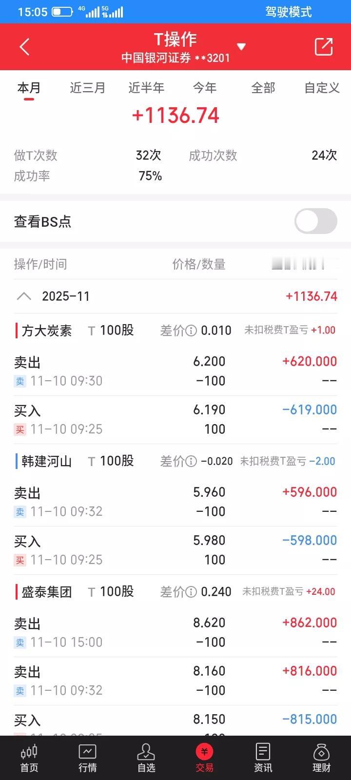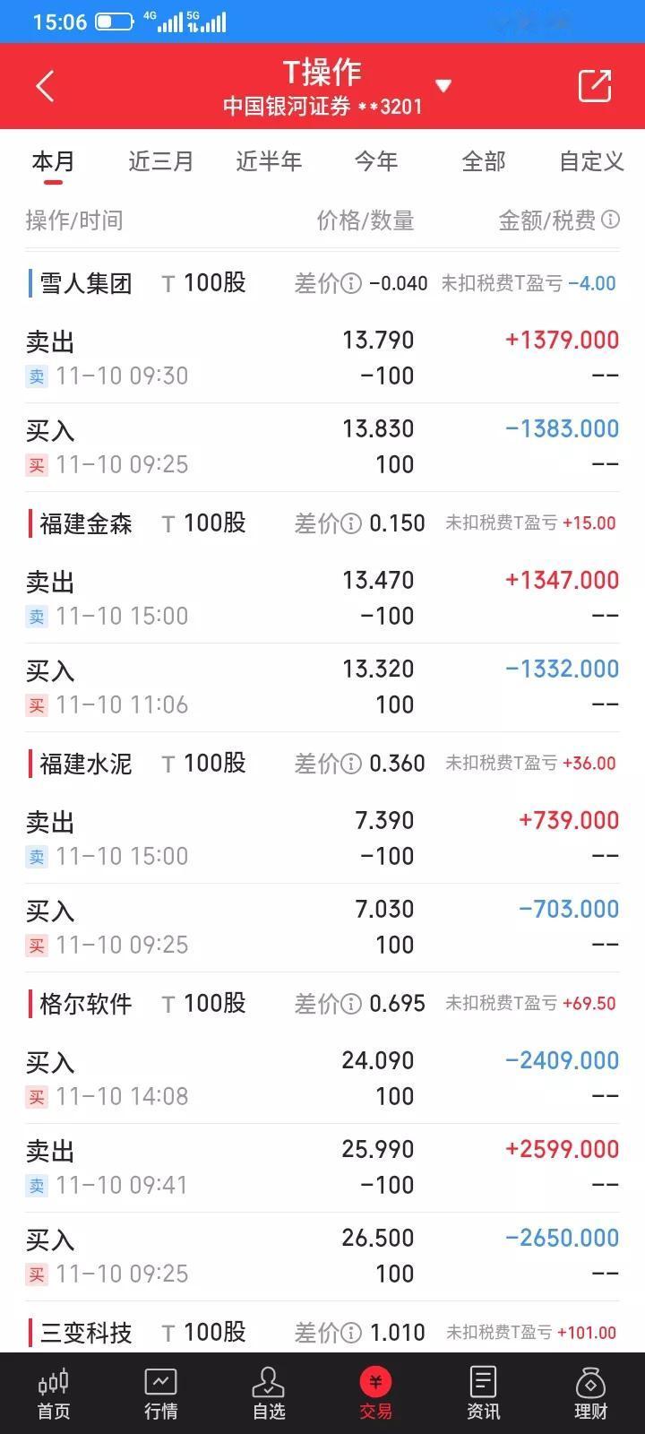 2025.11.10,今天t了100股方大,赚1块钱,t了100股韩建,亏了2块钱,t了100股盛泰,赚24块钱,t了100股雪人,亏了4块钱,t了100股金森,赚15块钱,t了100股福建水泥,赚36块钱,t了100股格尔,赚69块钱,t了100股三变,赚101块钱,t了100股亚邦,赚21块钱。今天做t,一共t了800股,一共赚261元。除掉印花税5.6元,2块钱左右佣金,净赚253块钱。也挺好的,当做了一天日结,比持股不动要好一点,降低持股成本。今后上涨的时候就赚多一点。