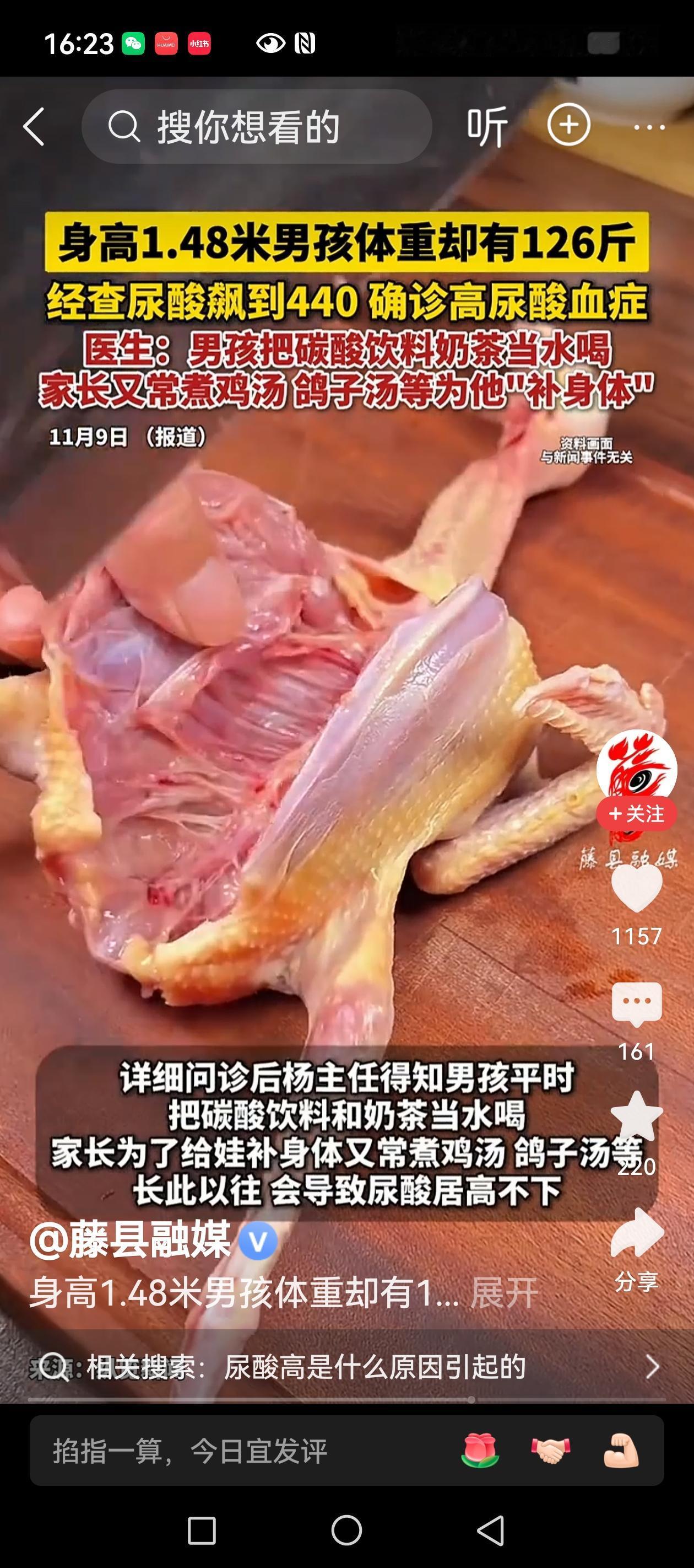 真没想到,竟然还有这样的家长,生生把孩子的身体“糟蹋”成这个样子。再次验证了那句话,孩子的坏习惯都是家长“惯”出来的。孩子1.48米的身高,却有126斤的体重,尿酸直接飙到了440,孩子本来就拿碳酸饮料当奶茶喝,家长还经常熬鸡汤给孩子补呢,这种疼法儿是有点儿过了。 我一向反对让孩子依赖碳酸饮料,平时基本不让外孙喝碳酸饮料,小外孙现在买饮料都知道自己看看配料里含不含果葡糖浆。 现在的年轻人追求无拘无束的生活方式,全然不会考虑会有什么后果,一些不健康的生活方式,自然也就影响着自己的子女。老人的话都当耳旁风,殊不知过来人才最有发言权,年轻时不良的生活习惯,早晚是要自己买单的。现在,三高人群的年龄越来越趋于年轻化,不得不说与对快餐、饮品的过度依赖和其他的不良生活习惯有关。不知大家有什么看法!