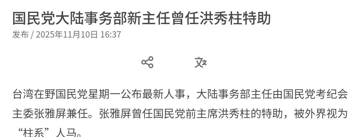 郑丽文作出关键性任命!“柱系”人马得到重用!11月10日,国民党再次作出新的人事任命,国民党宣布大陆事务部主任由国民党考纪会主委张雅屏兼任。岛内媒体称,张雅屏曾任国民党前主席洪秀柱的特助,被外界视为“柱系”人马。很显然,这一任命非常的关键。 因为,大陆事务部主任一职主要负责与我们的交流,沟通,对话。而郑丽文选择洪秀柱一系的人马,某种程度这是一个风向标。因为在国民党内部,洪秀柱与我们交往非常的密切,对我们的情况非常的了解。而重用“柱系”,这意味着郑丽文高度重视与中国大陆的交流。 而就张雅屏本人而言,其曾公开表示,将坚持“一中”,即台湾是地名,中国是我们的国家。认为国民党应认清现实,不再幻想通过中间路线吸引选票,而应回归本位,凝聚核心支持者。很显然,张雅屏个人的主张非常接近洪秀柱的“一中同表”,相信有了张雅屏的相助,郑丽文与我们打交道时会更加的顺畅。