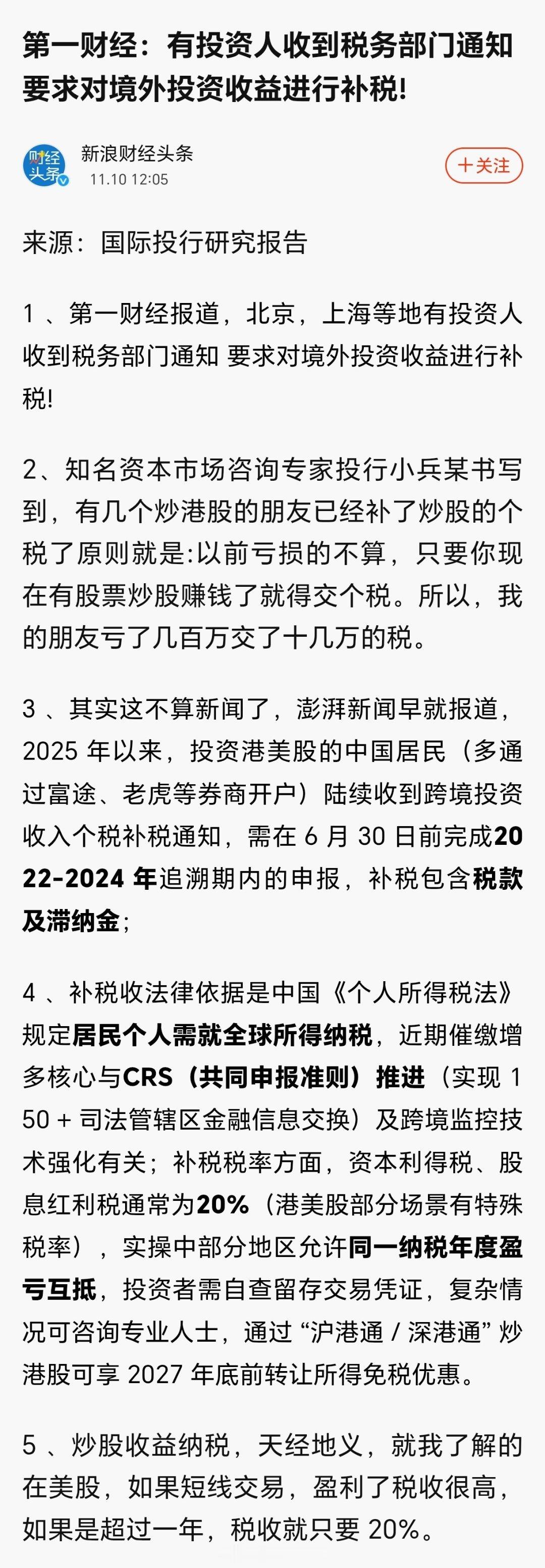 第一财经:有投资人收到税务部门通知、 要求对境外投资收益进行补税