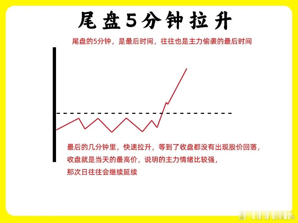 尾盘的5分钟,是最后时间,往往也是主力偷袭的最后时间,如果在最后的几分钟里,快速拉升,等到了收盘都没有出现股价回落,收盘就是当天的最高价,说明的主力情绪比较强,那次日往往会继续延续。如果股价快速拉升以后,随后开回调,到收盘,那有可能是主力的诱多,资金力量并没有那么强,有可能是主力的假拉升