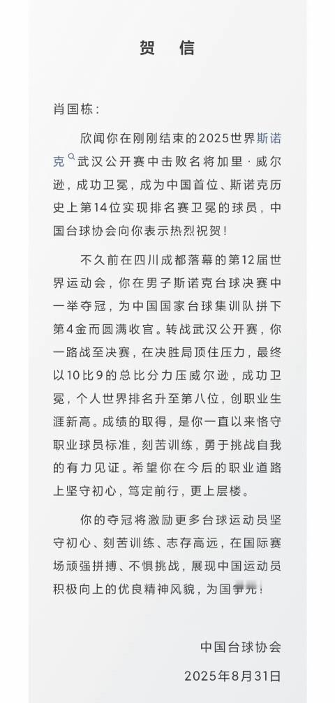 不干人事的台协多了一件事,给取得优异成绩的球员发贺信…… 拿给肖国栋的贺信和给吴宜泽的贺信对比看一下,程序化格式非常严重。贺信八股体:欣闻…+夺冠过程+夺冠意义…