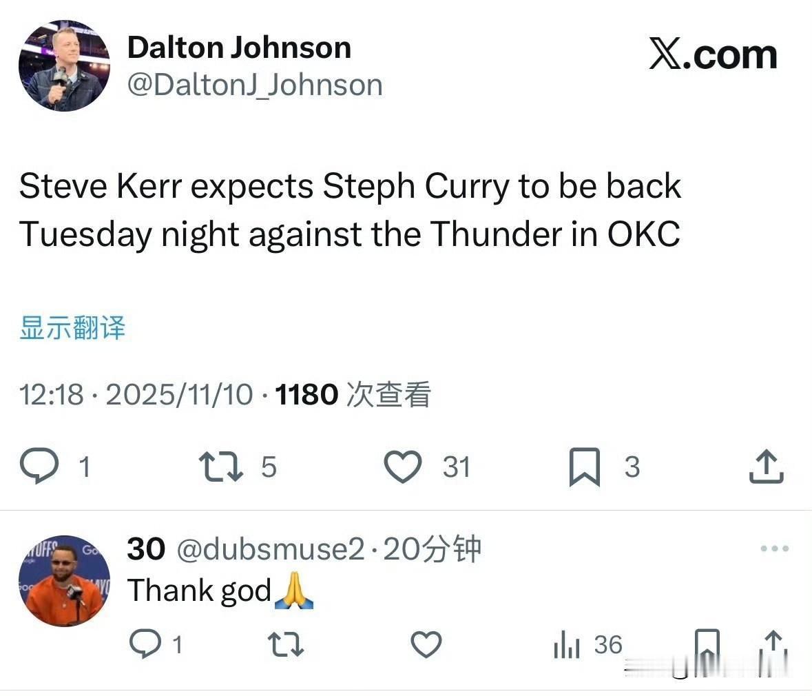 库里复出时间确定!!!库里将于周三客场对阵雷霆的比赛中复出! 根据记者约翰逊最