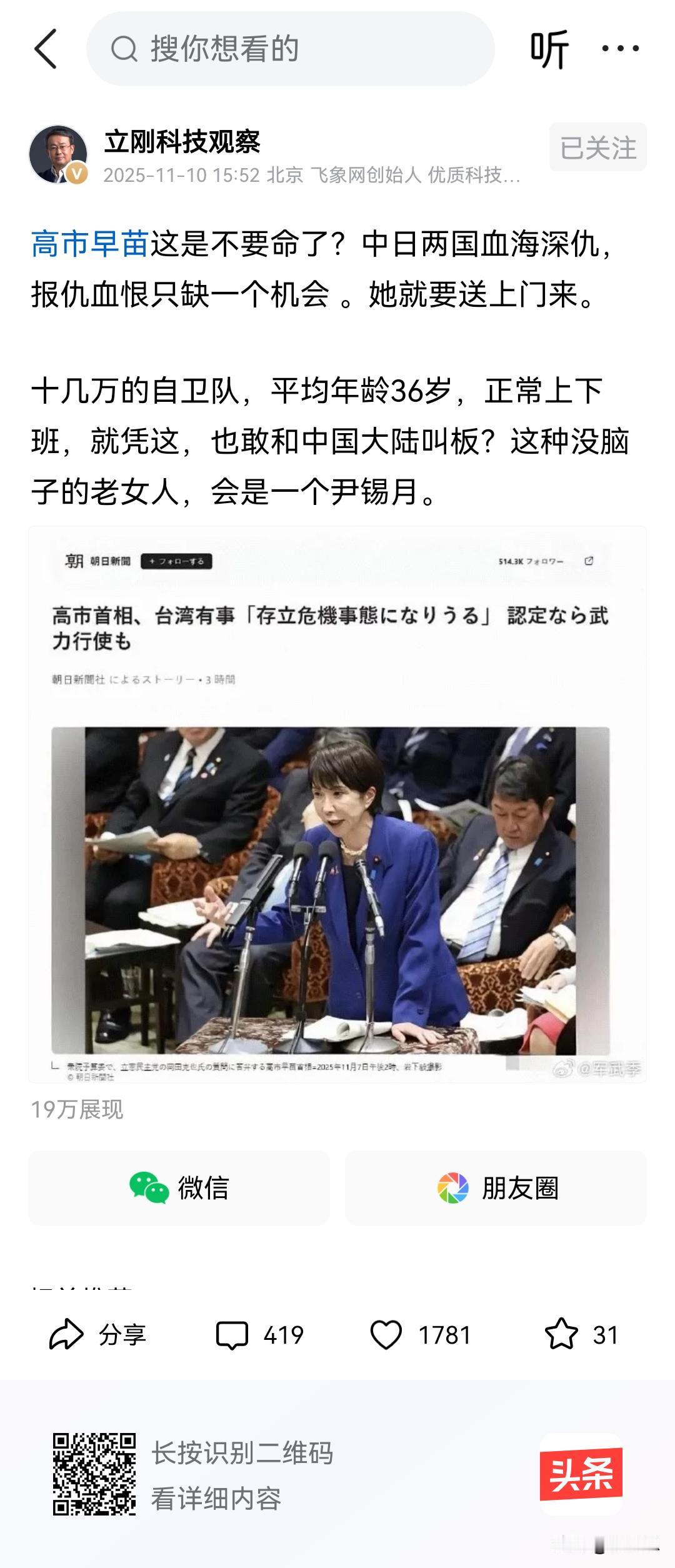 项立刚说高市早苗没脑子。我倒认为她不是没脑子,她只是想追随安倍的脚步。她可是安倍的得意门生。安倍最先提出台湾有事就是日本有事。现在高市早苗升级了安倍的言论,他说台湾安全事关日本的存亡。相当于她把台湾当成日本的国土了,对于她此番言论,中国的网友都比较淡定啊。甚至乐观其成,希望高市妇人能够说到做到。