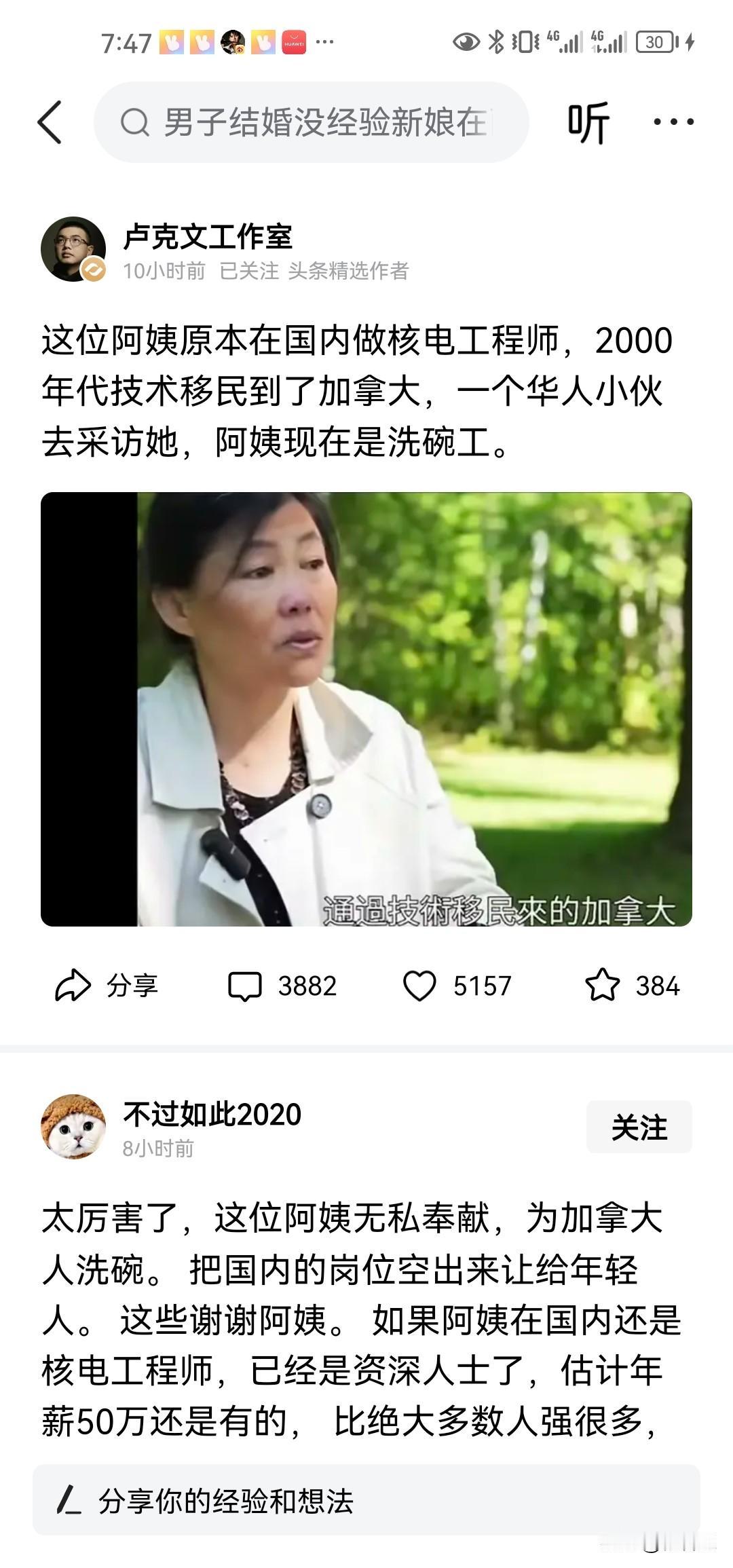 在我们看来其实挺悲哀的啊,一个中国的核电工程师2000年通过所谓的技术移民到加拿大。现在做清洁工,做洗碗工哦。难道加拿大不需要技术人才吗?难道他们只需要洗碗工?如果她当年没有移民,她现在退休金也会上万块了,是吧?当然了,公知们会这么说:不管她现在干什么工作,起码是实观了心里的愿望,能够踏出国门,干什么工作都行,没有遗憾了[捂脸]