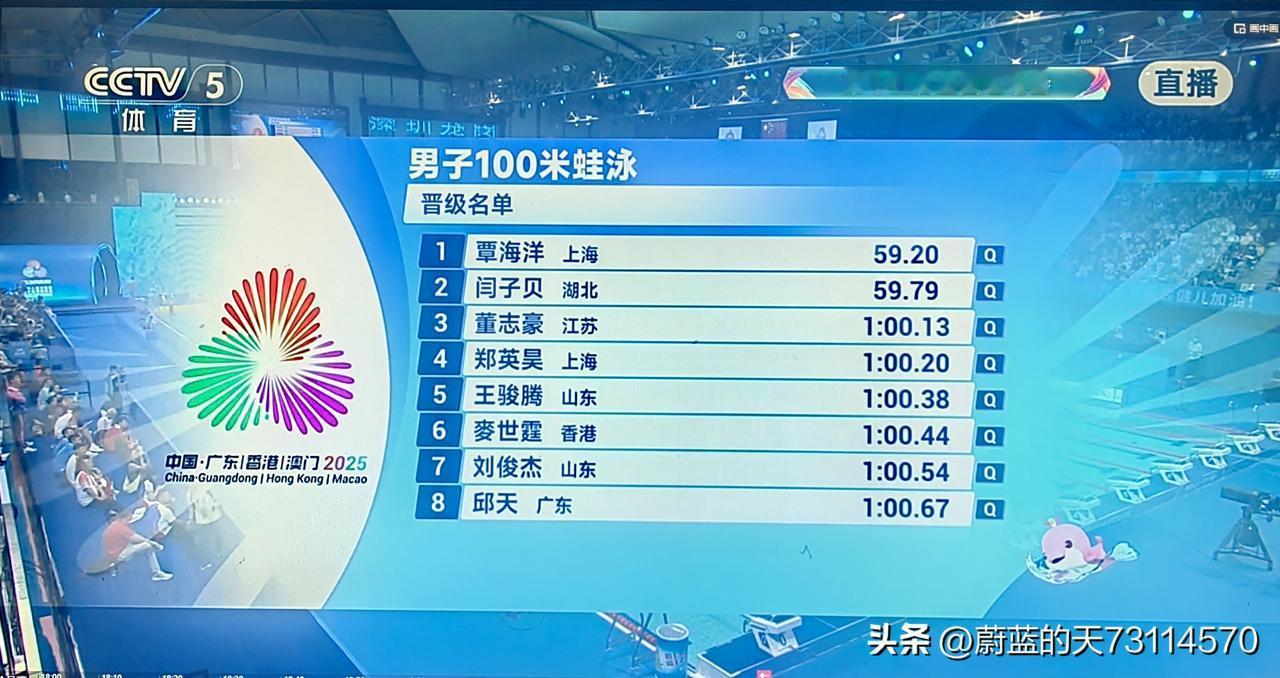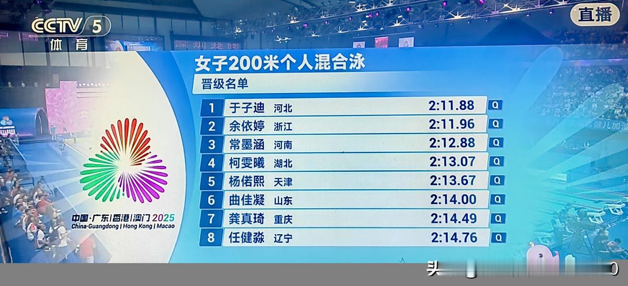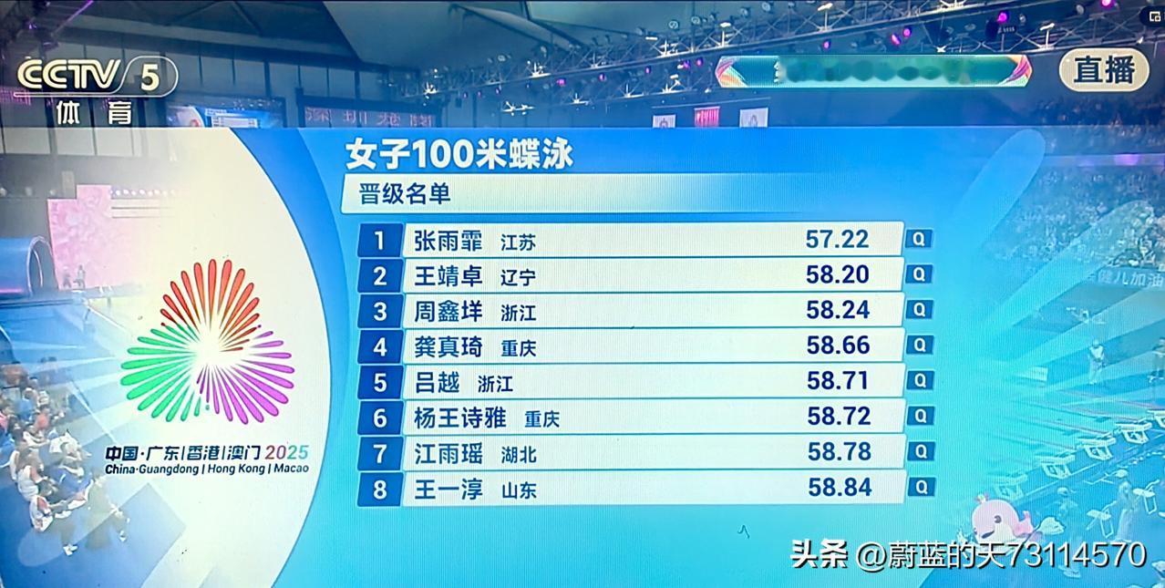 [福][福][福][福]第十五届全运会的金牌大户——游泳项目,共设有41个比赛项目。首个比赛日(11月10日)的决赛于今晚打响,将产生四枚金牌。 一、半决赛: 1. 女子100米蝶泳:名将张雨霏(江苏)半决赛第一,晋级决赛(见截图四)。 2,男子50米蝶泳:名将王长浩(天津)半决赛第一,晋级决赛(见截图五)。 3, 女子200米个人混合泳:名将于子迪(河北)、余依婷(浙江),半决赛前两名,晋级决赛(见截图六)。 4,男子100米蛙泳:名将覃海洋(上海)半决赛第一,晋级决赛(见截图七)。 二、决赛: 1. 男子400米自由泳 金牌🥇:张展硕(山东)3分42秒82 银牌🥈:徐海愽(湖北)3分47秒73 铜牌🥉:费立纬(浙江)3名47秒91 2. 女子400米自由泳 金牌🥇:李冰洁(河北)4分01秒17 银牌🥈:杨佩琪(湖北)4分01秒90 铜牌🥉:柳雅欣(浙江)4分03秒20 3. 男子4x100米自由泳接力 金牌🥇:浙江队,3分15秒01。 银牌🥈:河南队,3分15秒47。 铜牌🥉:公安体协,3分16秒14。 4. 女子4x100米自由泳接力 金牌🥇:山东队,3分36秒51。 银牌🥈:浙江队,3分36秒61。 铜牌🥉:河北队,3分38秒90。