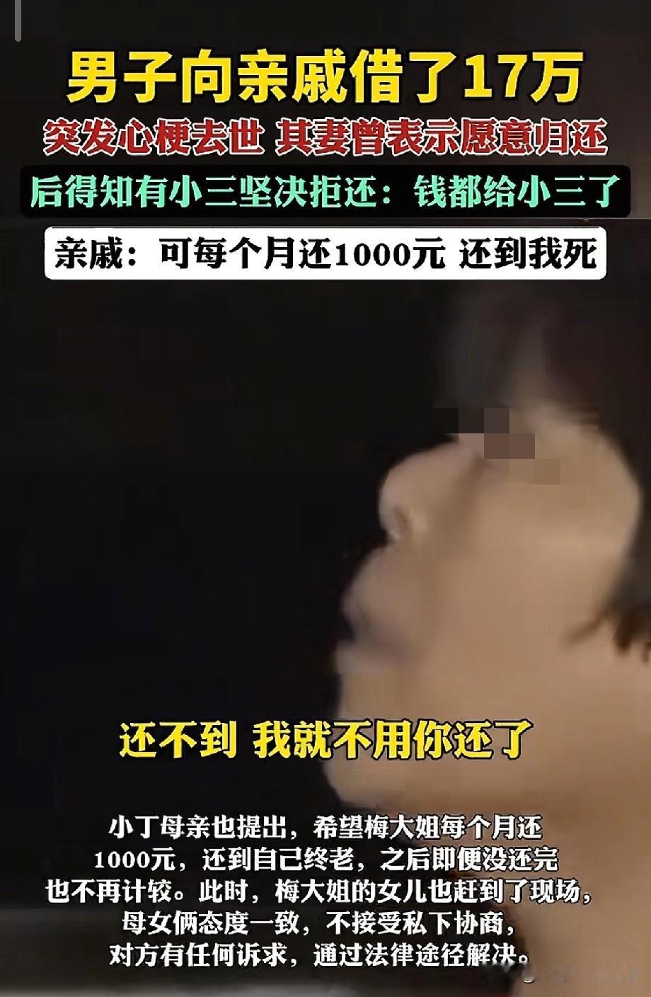 人没了债却找上门,浙江金华,有人就碰到了这样的烦心事,好心借给亲戚17万,借钱的人因为意外没了,债主去要欠款,借钱人的妻子却不肯认!债主和介绍人的妻子都很委屈。 原来债主是小丁的爸妈,这17万是小两口起早贪黑卖小吃赚来的辛苦钱,两家也是常来常往,关系挺好的。借钱的这个表哥,平常对老两口也挺照顾,所以当这个表哥开口需要借钱的时候,两人也就将这钱借给他,陆陆续续三年间借了17万。 这其中有5万是表哥给20岁女儿办生日酒席用了,还有 10万是表哥包矿石亏了,小丁爸爸特意贷款借钱给他周转的。 没想到钱借出去了没多久, 表哥突发心梗去世了,这一下钱就变成了糊涂账。眼看这笔钱就要到还款的日子了, 小丁一家人就找到表嫂梅大姐,想让她先周转一下,可表嫂却翻脸了,之前答应的好好的说会还钱,现在直接改口,说自己根本没用到过这笔钱 。 原来是表嫂发现表哥早就出轨了,手机里留着各种节日转账记录,520,1314啊这类得有七八万。表嫂表示她没见过这17万 更没道理替背叛自己的人还债。 小丁父母也顾忌双方亲戚关系,表示让表嫂每月还1000还到终老,如果没还完剩下的也就算了。 表嫂和女儿不同意这个方案因为之前协商的时候小丁之前出言不逊发了很多难听的话,表嫂坚持不肯认这笔钱,双方始终谈不妥。 最终小丁询问律师能不能通过法律途径解决,律师表示,这笔债该不该还,关键看是不是夫妻共同债务,或者梅大姐有没有继承表哥的遗产。 对此网友们也是各有各的看法,有的认为人死债消,有的表示梅女士能不能拿出证据证明自己这笔钱没用过,如果能证明,且不准备继承遗产的话,可以不用还。 我觉得小丁父母好冤枉,本来也不是啥富裕家庭,十几万可能是两口子一辈子的积蓄,本来是帮帮亲戚也算做好事,哪知道会有这种结果! 所以说借钱太难了,大家碰到过这样的事吗?不妨评论区交流下? 男子去世后曝出17万债务 妻子拒还