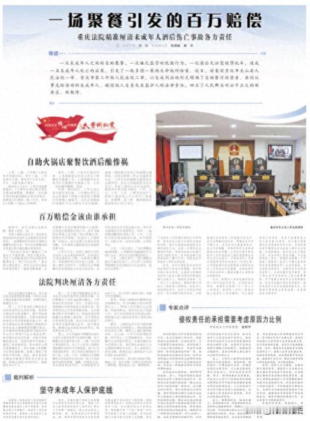 重庆,7名高一学生相约在自助火锅店AA聚餐,期间大量饮酒,又酒后无证驾驶摩托车,最终导致一名学生死亡,这起由未成年人自助聚餐、缺乏监管饮酒及酒后无证驾驶引发的纠纷案,经一审、二审,最终明确了各方的责任。 事发当天,这7个高一学生,本是去自助火锅店聚餐,店里酒水饮料混放,除了一个人没喝,其余6人都喝了三瓶以上啤酒。 聚餐结束后,部分同学先走了,小伟喝了酒,还无证驾驶无牌摩托车,载着小诚就走了。 结果路上出了碰撞,小诚受伤严重,送到抢救,也没救过来。 小诚父母觉得火锅店有问题,违法卖酒给未成年人,这才发生了悲剧,而且其他同学也没尽到提醒义务,得为此事负责。 火锅店可不这么想,他们店里已经广播提示了,不能向未成年人卖酒,小诚出事和店里没有直接因果关系,不应该担这么大责任。 小伟觉得小诚的父母监护不力,小诚自己有责任,明知道小伟喝了酒还坐他的,同行者也没尽到照护义务,不能光怪自己。 小翌、小龙说,聚餐是AA制,大家就是一起吃个饭,和酒驾这事没关系,不应该担责任。 小卓、小辉却说自己早就离开了,根本没法预见后面会发生这些事,不应该被牵连。 从情感上来说,小诚父母失去孩子,肯定痛苦,肯定希望有人能为孩子的事负责,其他各方也都有自己的理由,都不想担这个责任。 具体到本案,各方的行为,都需要用法律来衡量,看看谁该担责,担多少责。 根据《未成年人保护法》第五十九条规定,经营者应当在显著位置设置不向未成年人销售烟、酒或者彩票的标志;对难以判明是否是未成年人的,应当要求其出示身份证件。 火锅店把酒水饮料混放,还卖给未成年人,没有尽到应有的注意义务。 虽然广播提示了,但实际行为还是违反了法律。小诚出事和火锅店违法售酒有一定关联,所以火锅店应该担责。 小伟酒后无证驾驶无牌摩托车,还载着小诚,这是严重违反交通法规的行为。 《民法典》第一千一百六十五条规定,行为人因过错侵害他人民事权益造成损害的,应当承担侵权责任。 小伟的过错行为,直接导致了小诚的S,存在重大过错,应承担主要赔偿责任。 小龙、小翌,他们和小诚一起聚餐,虽然聚餐是AA制,但作为同伴,有相互照顾的义务,他们没有尽到这个义务,对小诚的S也有一定过错。 《民法典》第一千一百七十二条规定,二人以上分别实施侵权行为造成同一损害,能够确定责任大小的,各自承担相应的责任;难以确定责任大小的,应平均承担责任。 小诚自己,他作为未成年人,应该知道酒后坐车的危险性,但他还是坐了小伟的车,自身也有一定过错。 他父母作为监护人,没有尽到充分监护职责,也应承担一定责任。 小卓、小辉先离开了,应该担责吗? 从法律角度看,他们离开时,聚餐已经结束,对后续小伟酒后驾车这件事,他们确实无法预见和控制,没有过错行为,所以不应该担责。 火锅店已经广播提示了,为什么还要担责呢? 虽然广播提示了,但火锅店在实际经营中,没有严格遵守法律,把酒卖给了未成年人,这种行为本身就是违法的,不能因为广播提示了就免除责任。 最终,一审法院判决:火锅店担责10%,赔10.9万元;小伟担责40%,赔43.4万元;小龙、小翌各担责5%,分别赔5.45万元;小诚自身担责25%;其监护人担责10%。 火锅店上诉被驳回,最终,二审维持原判。