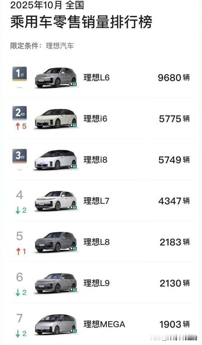 理想10月车型销量明细。 有点意外啊,一个破万的车型都没有。 最高的L6也只有9680辆,要知道这个车我记得之前是稳定月销两万+的。 i6和i8都是5700多辆,i6大把订单在手,产能还没拉起来,后续销量应该能看高一线,i8如果能稳定在这个水平,感觉也还行。 在后面就是L789一字排开,反正相比以往巅峰期,都是降了不少,理想L系列确实需要大改款了。 MEGA能卖个两千左右,已经是非常不容易。 新能源这么卷,蔚小理都要更努力才行……