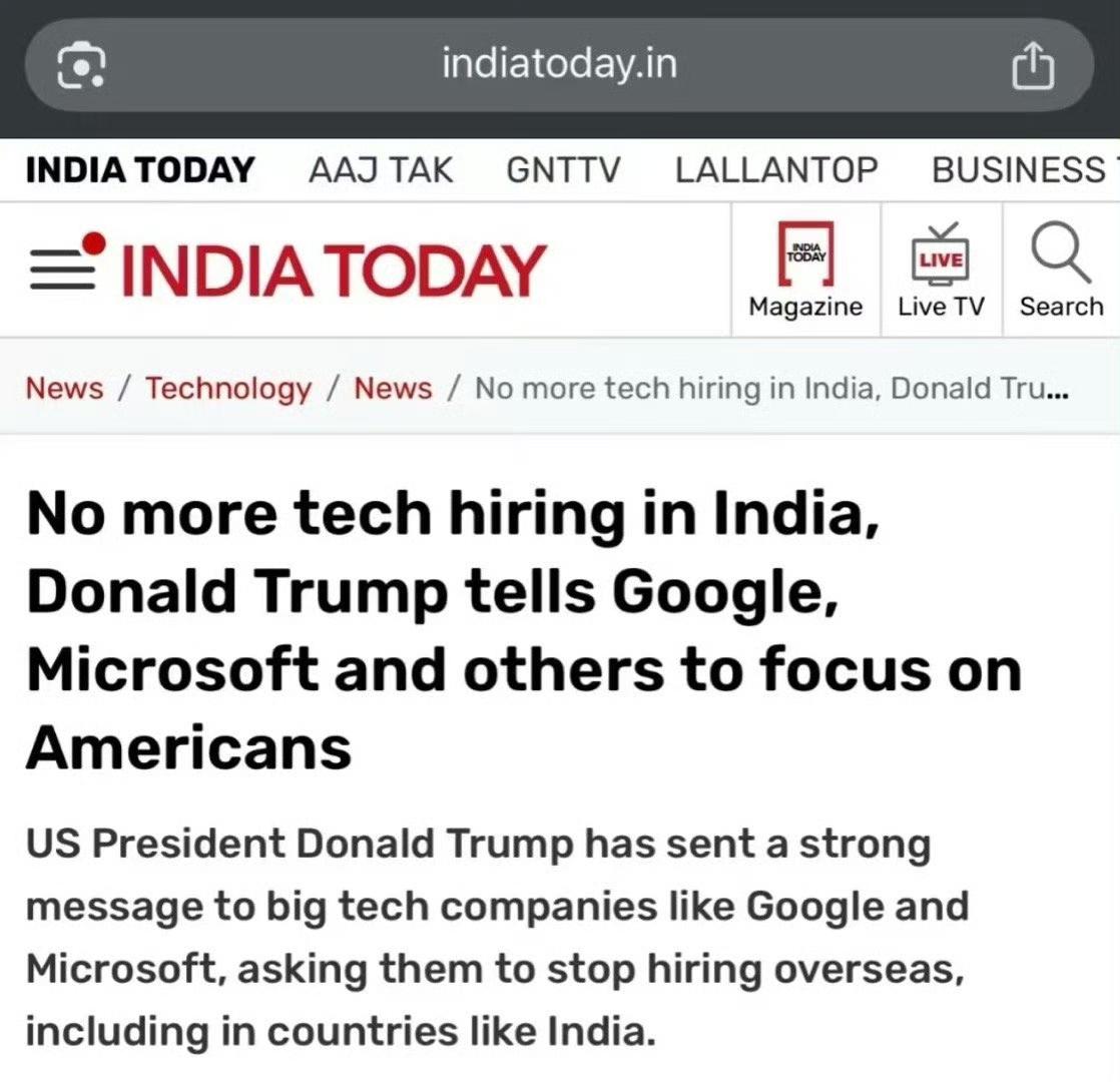 特朗普要求科技公司停招印度人!这不是标题党,虽然特朗普没明确点名印度人,只是要求科技公司停止在国外设立研发机构,停止招外国人。但是,印度媒体迅速跳出来激烈批判,坐实了最大受害者是印度人,其他国家都没什么反应,毕竟这是纯粹的美国内政。 也不怪印度媒体应激,特朗普还是点了印度的名,说苹果、微软、微软、谷歌、英特尔等大科技公司都在美国大规模裁员,与此同时却在印度扩招员工,这个情况必须立即停止,必须把工作岗位转移回美国。 印度人有一点令人百思不得其解,本土印度人内讧严重,但是一旦出国后,印度人就会迅速抱团。这是什么缘故?