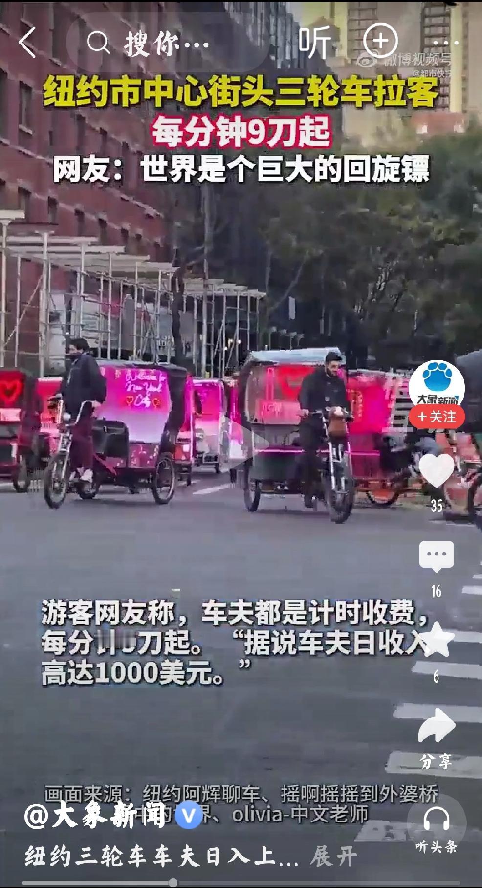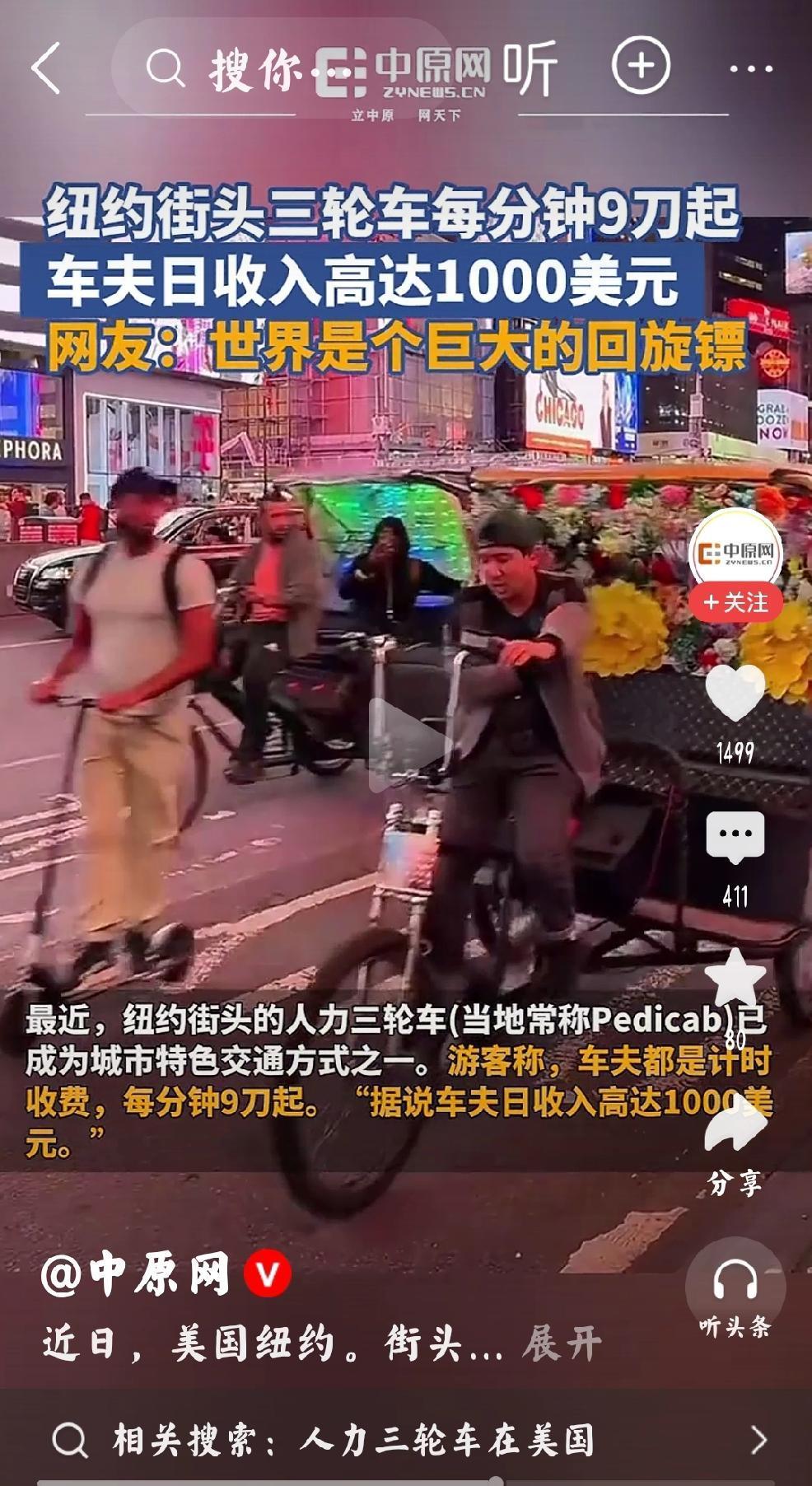中美现状对比:非常奇妙 个人观点:世界唯一的超级大国,全球大名鼎鼎的超级城市— 纽约,居然流行三轮车。发展中的国家— 中国即将开始,飞行汽车的运行。 个人只能说,从美国的现状看到了晚清末期的影子。