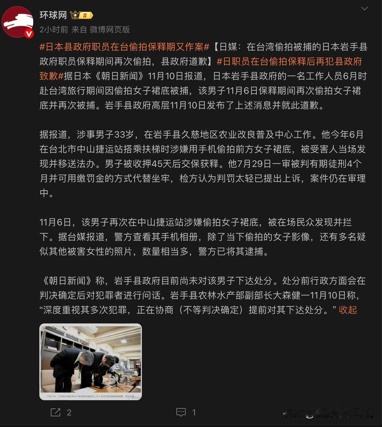 日本政府职员这次玩儿了把大的,刚刚因偷拍保释出来又偷拍,关键又被抓了现行。日本岩
