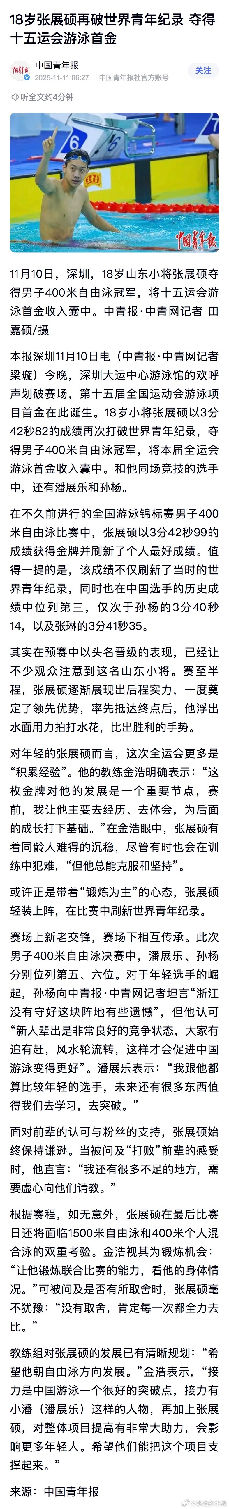 教练组对张展硕的发展已有清晰规划:“希望他朝自由泳方向发展。”金浩表示,“接力是中国游泳一个很好的突破点,接力有小潘(潘展乐)这样的人物,再加上张展硕,对整体项目提高有非常大助力,会影响更多年轻人。希望他们能把这个项目支撑起来。”
