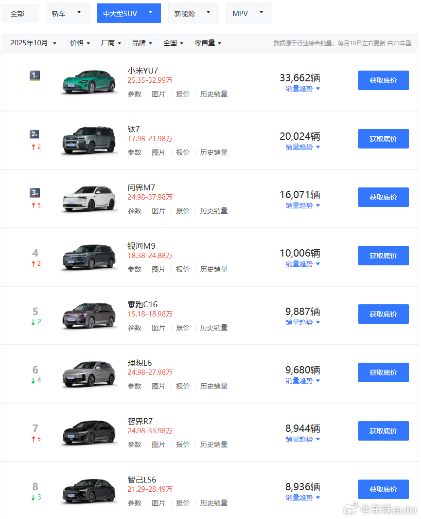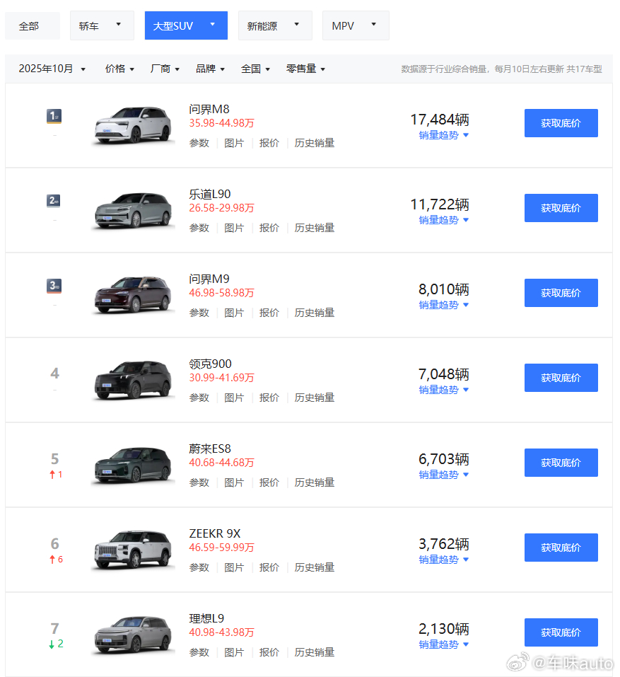 问界M8因为自家M7的分流,月销低于2万,但依然领跑大型SUV销量榜,
