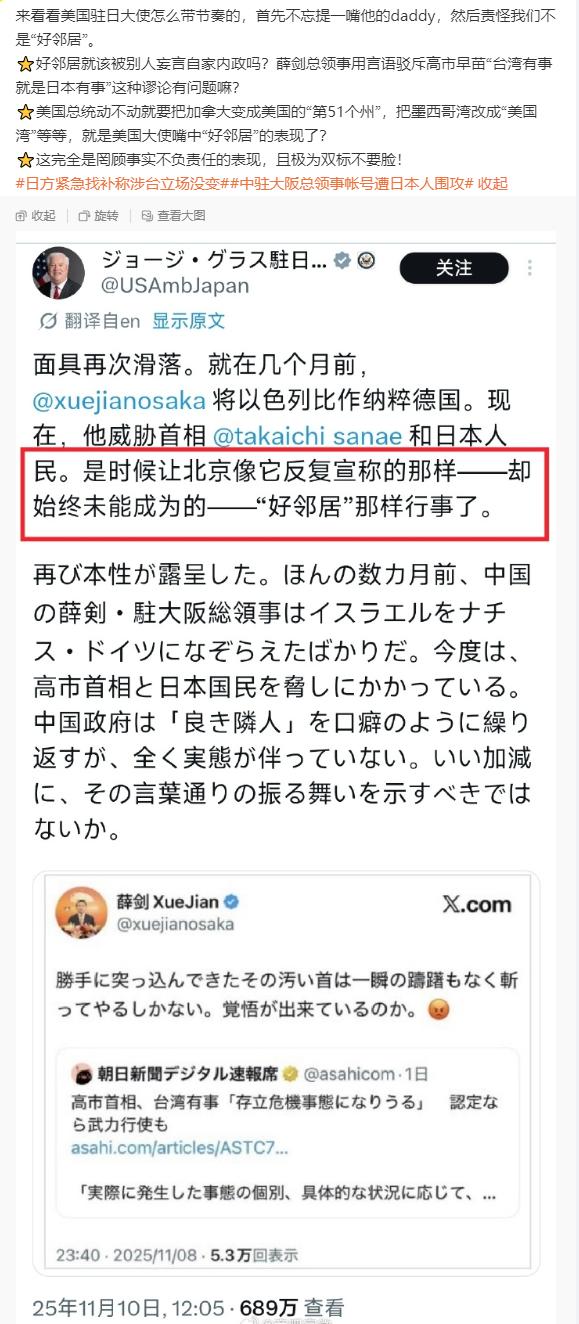 日本大使:侮辱日本等同于宣战日本驻澳大利亚大使山上信吾11月10日发文:“侮