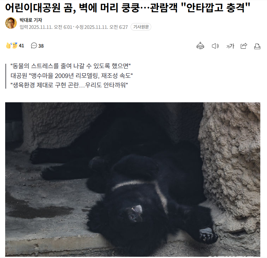 据首尔市11日消息,游客刘先生近日在向首尔儿童大公园提交的民怨中表示:"大象、熊等动物出现了重复的刻板行为",并特别指出"尤其是熊持续用头撞墙的行为,让人看了既心疼又震惊。"
