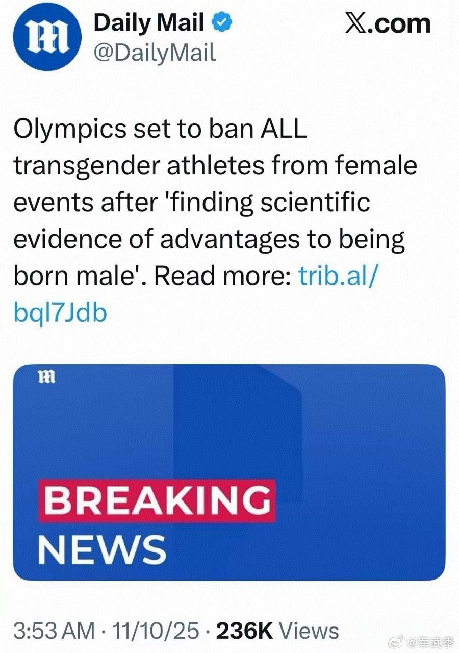 奥运会将全面禁止跨性别运动员参加女子项目,因为官方“找到了科学证据,表明出生时为男性会带来优势”。这种证据还需要研究搜寻?