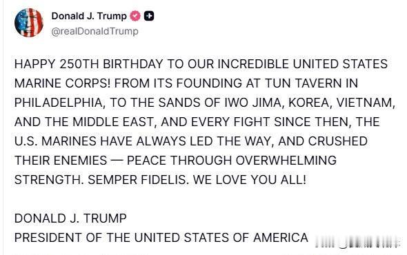 川普发文庆祝海军陆战队成立250周年,称赞海军陆战队永远忠诚。 “热烈祝贺我们了不起的美国海军陆战队成立250周年! 从费城Tun酒馆的成立,到硫磺岛、朝*、越*和中东的沙场,以及在之后的每一场战斗中, 美国海军陆战队始终冲锋在前,粉碎敌人——以压倒性的力量赢得和平。 永远忠诚(Semper Fidelis)。我们爱你们每一个人!”
