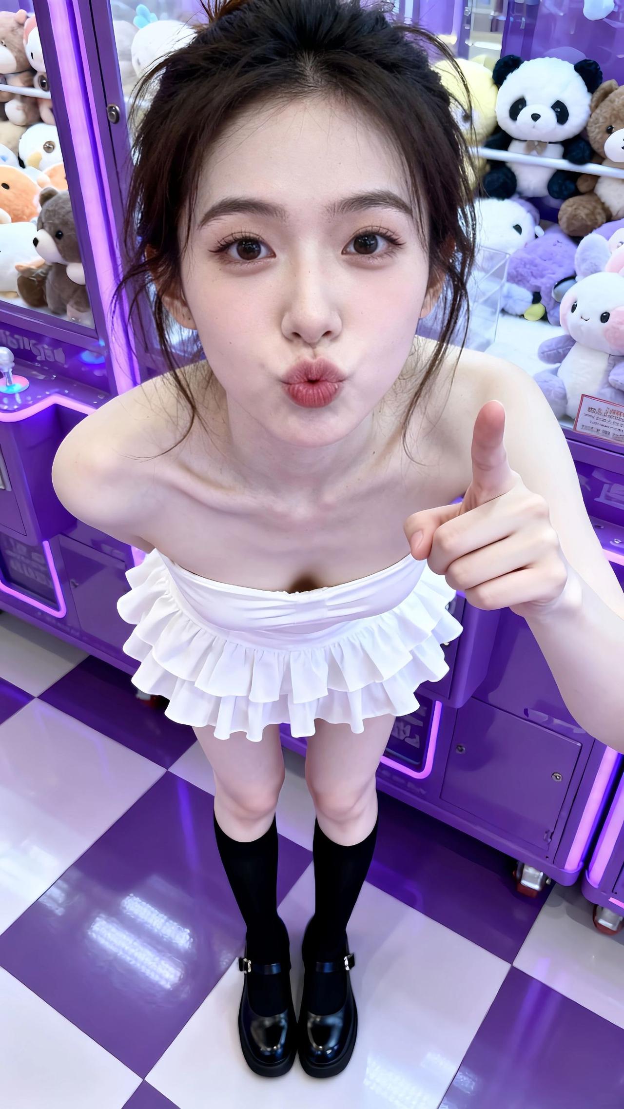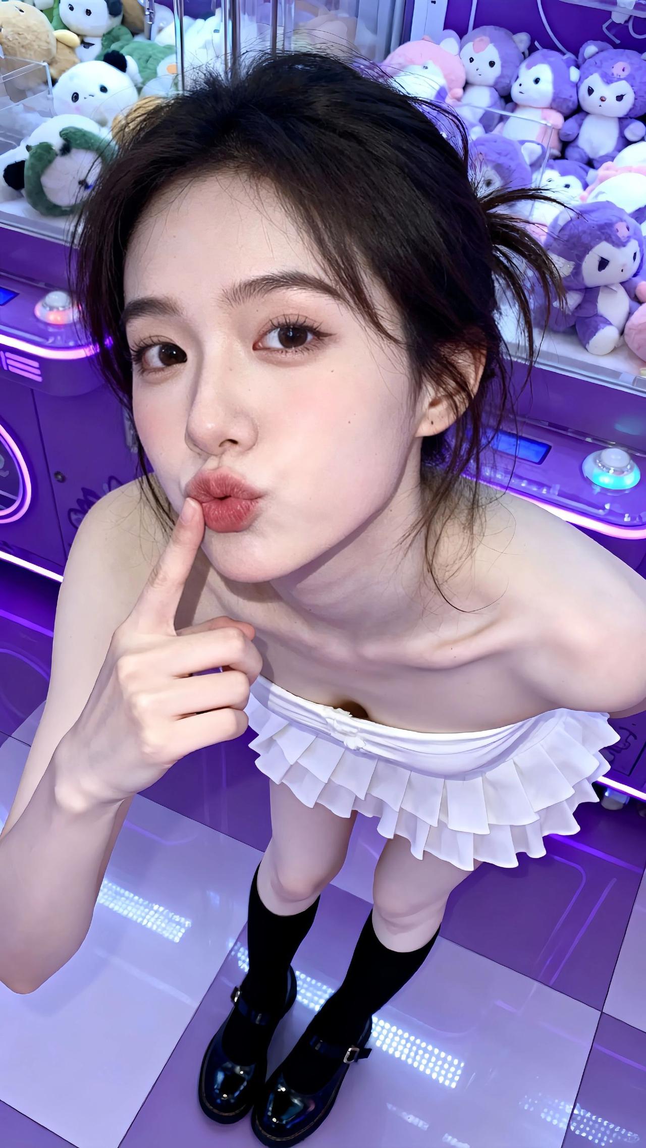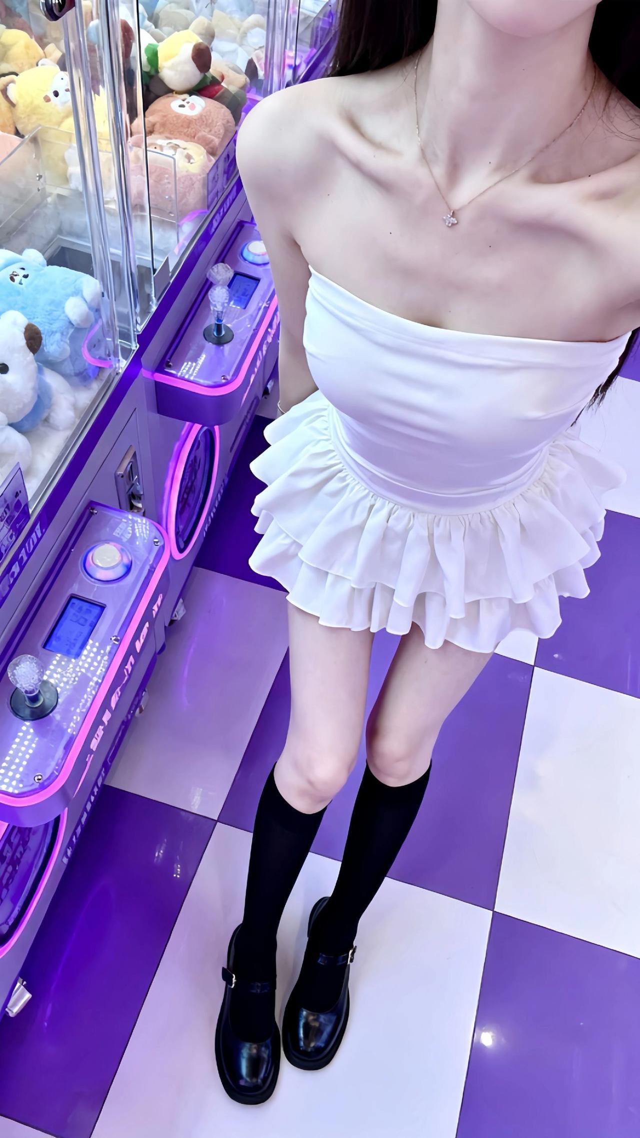 这位小姐姐正在夹娃娃机前拍照呢。女人穿裙子配什么鞋显得更有品味? 什么样的裙子才能兼顾优雅与迷人? 配裙子穿什么鞋 吊带背心搭配什么样的裙子呢