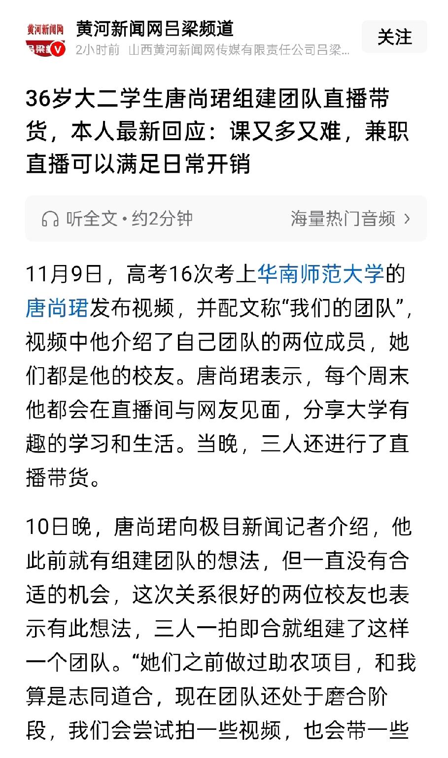 把人生熬成流量。 对唐尚珺来说,“复读16年”早已不是求学执念,而是他最值钱的“个人IP”——只是这IP的底色,总带着点“把人生熬成流量”的荒诞。 有人说“他早算好了这步棋”:从16次高考的“执念人设”,到入学后的“课多难学”,再到如今组校友队带货,每一步都踩在舆论的痒点上。 毕竟“36岁大二生直播”本身就是话题, 哪怕卖的是普通商品,也能靠“复读16年的大学生”标签收割一波好奇流量。 现在为了“爆款”,有人造谣蹭灾,有人消费逝者,连公共事件都能当成“涨粉素材库”——流量成了标尺,底线成了可以让渡的“引流成本”。