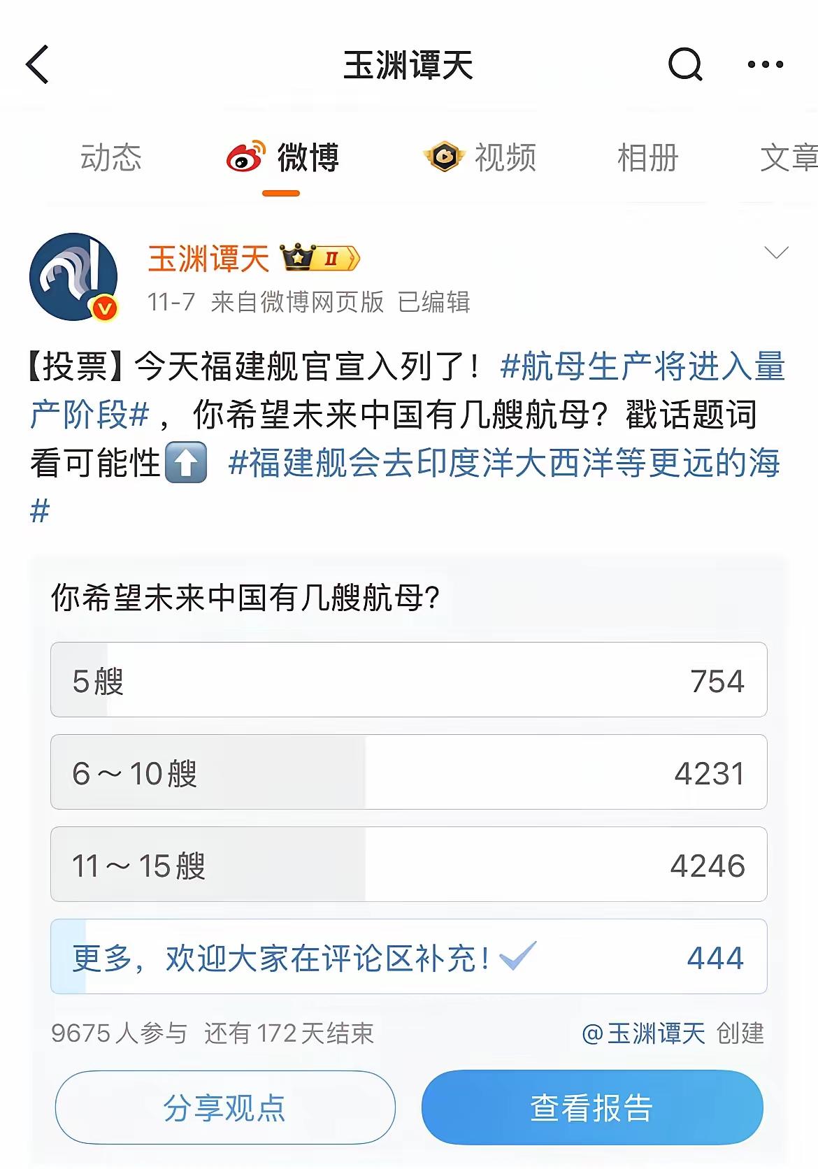 福建舰入列后,网友给航母“下订单”:6-15艘?这届网友比船厂还敢想! 福建舰刚官宣入列,网友直接把“航母订单”给排上了——玉渊谭天的投票里,9000多人吵翻了天,主打一个“我比军工还懂量产”! 投票一放出来,选项直接给了“5艘”“6-10艘”“11-15艘”“更多”四个档,结果6-10艘和11-15艘的票数差点打平,加起来占了87%。评论区更是大型“甲方现场”: “建议先整个‘航母套餐A’(6艘)试试水,不够再加!” “15艘刚好凑个‘远洋豪华团’,走哪都有排面!” “船厂:你们先别催,图纸还没画完呢!。” 更离谱的是有人补刀:“福建舰刚‘上班’,网友已经在给它招‘同事’了,这效率比HR还高!” 还有人脑洞大开:“以后航母是不是能像‘点外卖’一样,‘亲,这边建议您选10艘套餐,送舰载机大礼包哦’?” 其实网友的“敢想”,本质是福建舰给的底气——从辽宁舰“启蒙”,到山东舰“入门”,再到福建舰“进阶”,如今“量产”信号一放,大家直接把“海军梦”拉满了。 毕竟航母多一艘,咱的“海上安全感”就多一分,这波“催单”,是最硬核的浪漫!