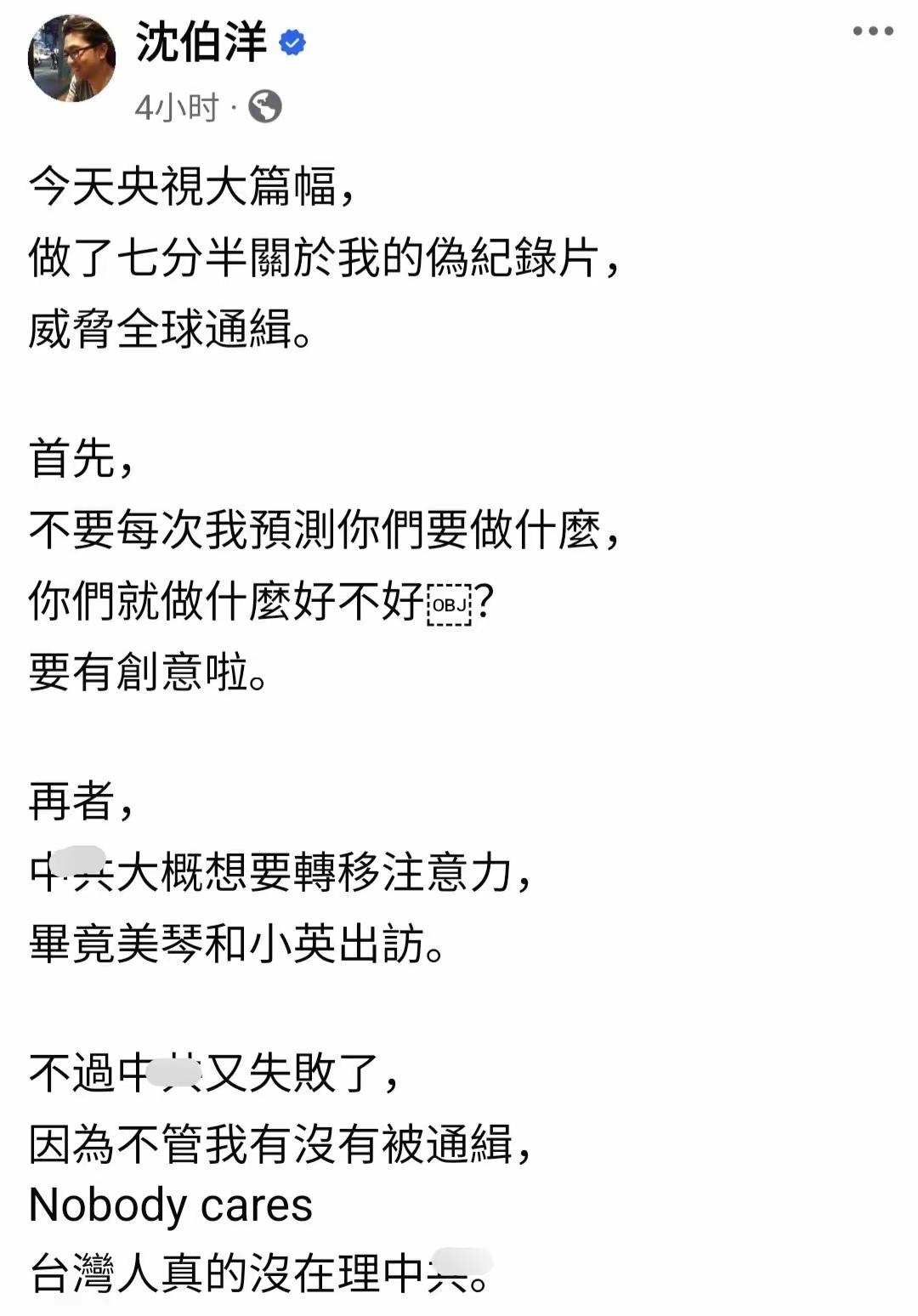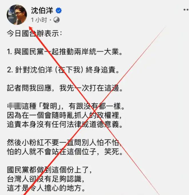 沈伯洋社媒发文嚣张至极!自从被重庆警方通缉之后,这家伙在社媒发文,装出一副满不在乎的样子。央视起底沈伯洋的“台独”路,将其卑劣行径全面展现在大众面前。 从心理角度分析,越装的毫不在乎,内心可能对这件事看的越重。沈伯洋嘴上说着无所谓,内心肯定也是担惊受怕。如果大陆发布全球通缉令,这家伙出门还能逍遥自在? 一旦收复台湾,沈伯洋之流肯定是定点目标,绝不给他们一点向外流窜的就会。必须让他们,为其所作所为付出代价,让他们睁开眼睛,亲眼看着台湾回归祖国的怀抱!