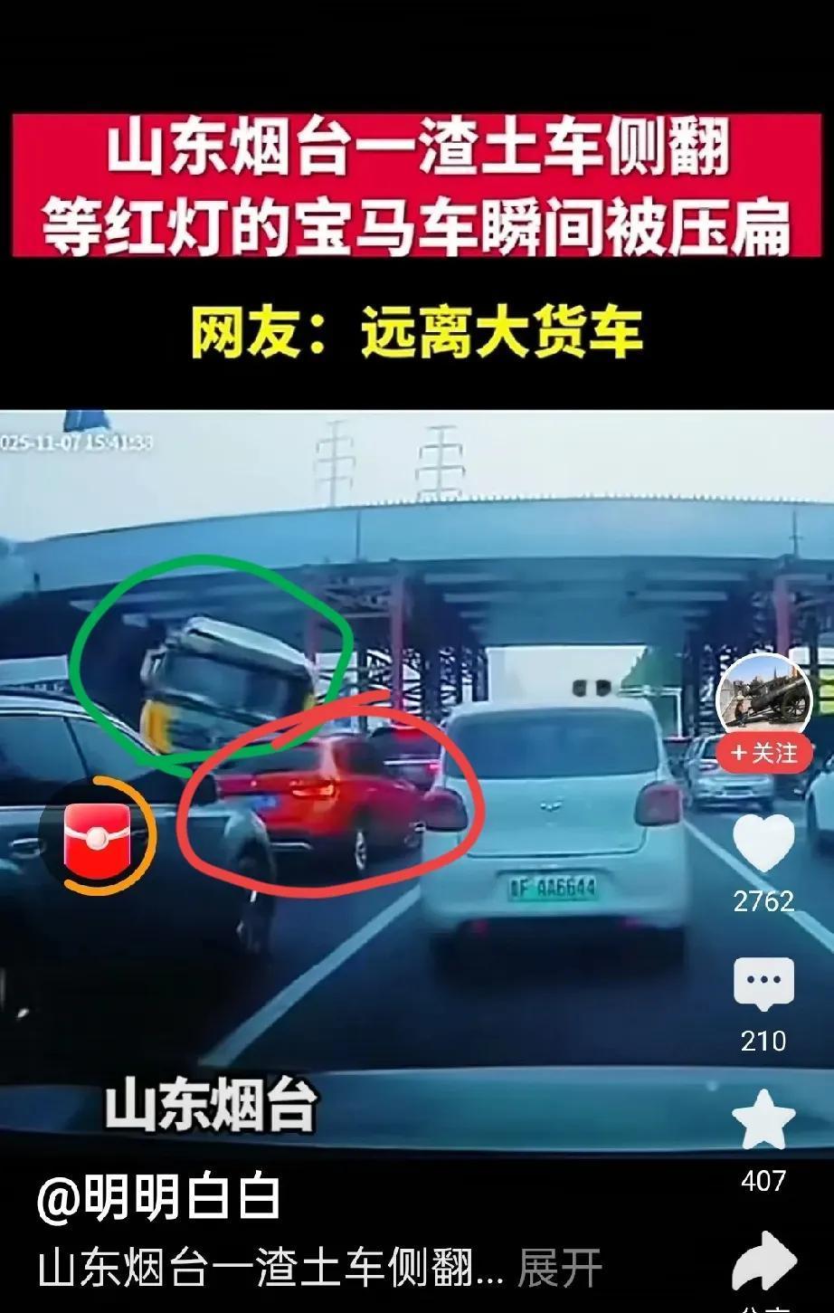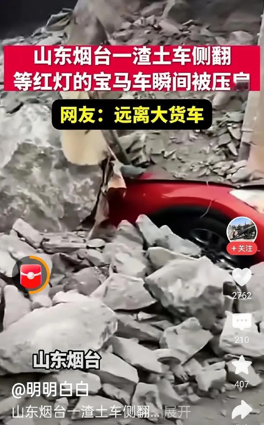 大货车应该改名叫“大祸车”!⚠️ 最近山东烟台一辆宝马车被突然冲出来的大货车侧翻给压垮了,里面的人也完了,现在身份查出,是一位女教师,可惜了,这可是“园丁”啊~~~🙏🏻🙏🏻🙏🏻[可怜][泣不成声] 然后很多该视频下面评论区里众说纷纷,最多的一种说她“应该远离这种车”,平常情况下这样说没有错,毕竟防患于未然嘛,但是,她这种情况你在说这种话就很不合适了,看图👇🏻,事发突然,她已经先在事发地,而且前后左右都是车,她处在众多车辆包夹之下,根本无路可逃,大货车是后来突然冲出来的,这谁能事先预料到?她要是能料到她今天肯定就不出门了! 所以,有些时候有些情况不是你想躲开想远离就能做到的,再说一遍——她当时已经处在多车包夹之下,她往哪里跑?往哪里远离呢?谁会知道突然杀出一辆大货车?谁又会知道这大货车会突然侧翻? 所以那些说“让她远离大货车”的的都是吃的香草灰 放的轻巧屁、屁话一堆![刀] 总之这女教师今天出门就已经被阎王爷锁定了,她的名字在生死簿上已经到点儿了,没办法,天命不可违——阎王让你三更死,谁敢留人到五更?她的寿数到了!唉~😣