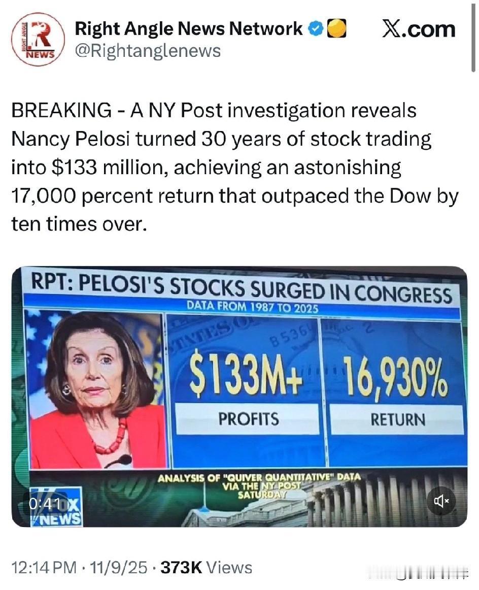 Nancy Pelosi的股神称呼实至名归,巴菲特在她面前都不够看。 根据《纽约邮报》的一项调查披露,Nancy Pelosi通过30年的股票交易,赚取了1.33亿美元,实现了惊人的 16,930% 的回报率,是道琼斯指数同期涨幅的十倍。