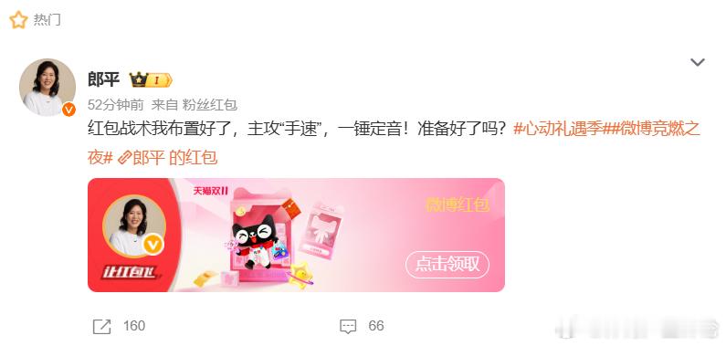 这一次,郎指导的“击球”变成了传球,通过惊喜红包继续向我们体育迷传递她的心意。不过,“铁榔头”的“传球”可不是那么好接的,比拼咱手速和手气的时候到了,你们抽到多少?让我看看谁才是手速之王[哈哈]