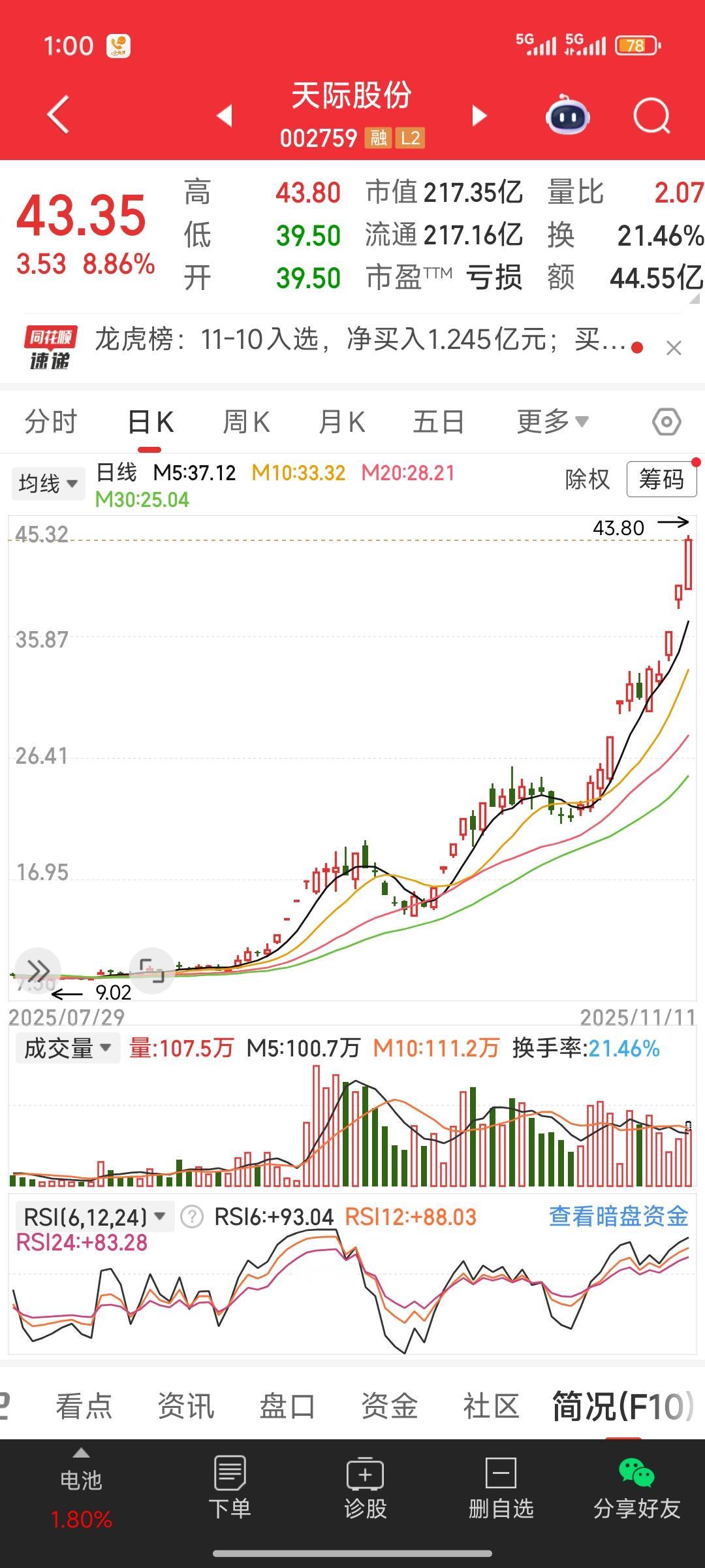 最近天际股份(002759)这股价,真像网友说的,要涨到天际外了!10月31日涨