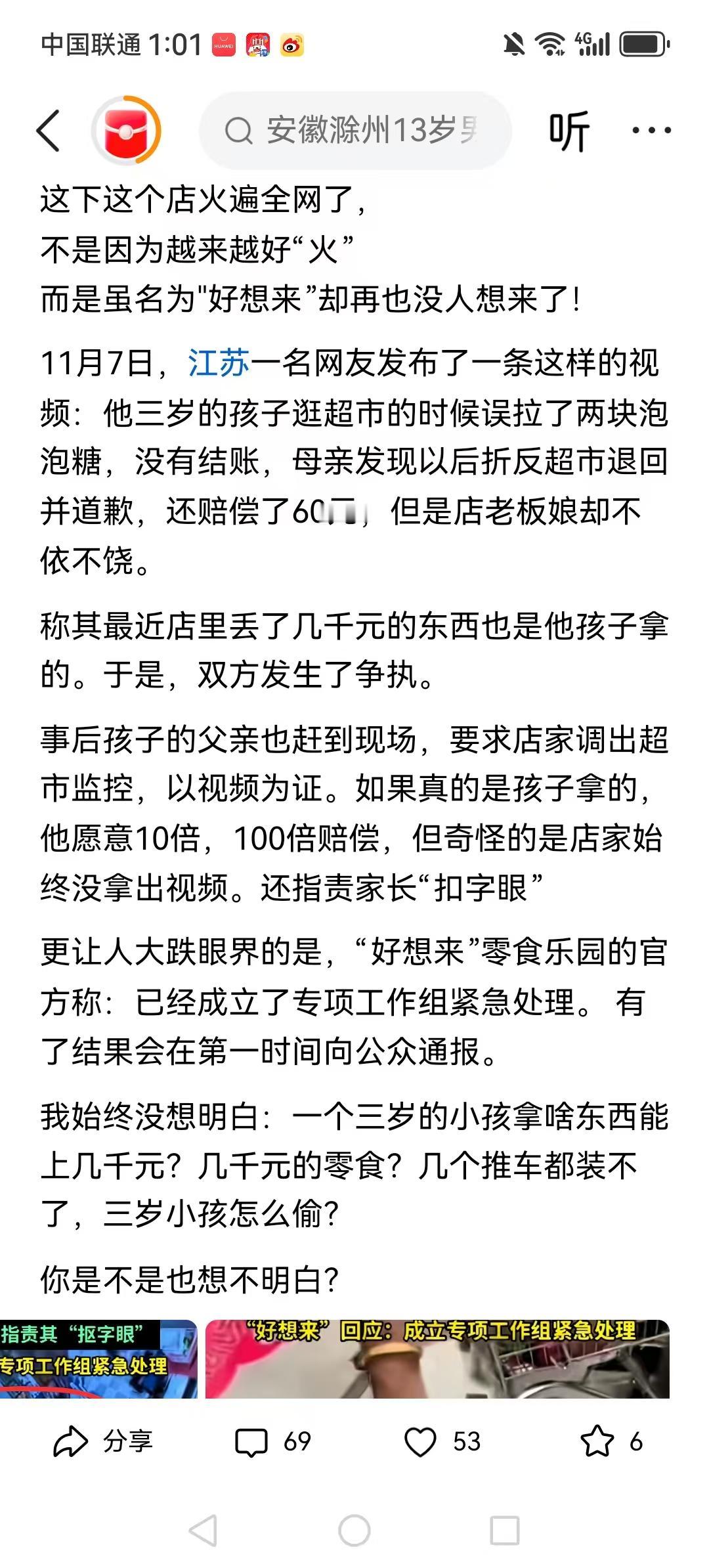 这下这个店火遍全网了,如果拿不出视频证据,商家涉嫌诬陷三岁小孩儿偷几千块钱的零食!所以到底是几千?别希望小孩大人有大量,必须起诉。 家长可以马上赔他三五千块(好像是3千以上可以立案)然后反手报警告他们敲诈勒索。 在我印象里,这个超市卖的东西,小孩子就喜欢糖和膨化食品吧。薯片虾条那些包装大,也没有可能偷走。 偷走几颗糖也就几块十几块顶天了,几千块那得多大一兜。 是最近生意不好穷疯了,就这样的店铺下次谁还敢去他家啊。 如果是小孩拿的,父母应该赔偿,如果不是,商家就是污蔑,诽谤,就该赔礼道歉加精神赔偿? 商家栽赃陷害,敲诈勒索,报警处理,以法立案。 可能,店长自己拿的,然后正好栽赃给别人,店里的账清了。 店里有烂账,正愁没法平账,逮着个孩子来当猴哥搞。 好想来这个品牌这么臭,还诬陷别人,诬陷三岁的小孩,这种店谁敢去啊?