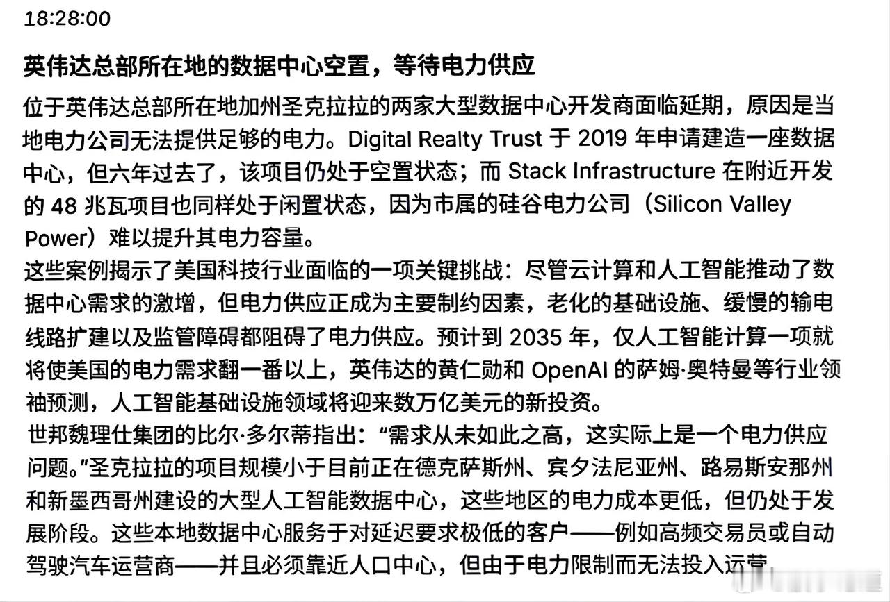 英伟达总部所在地的数据中心空置,等待电力供应。