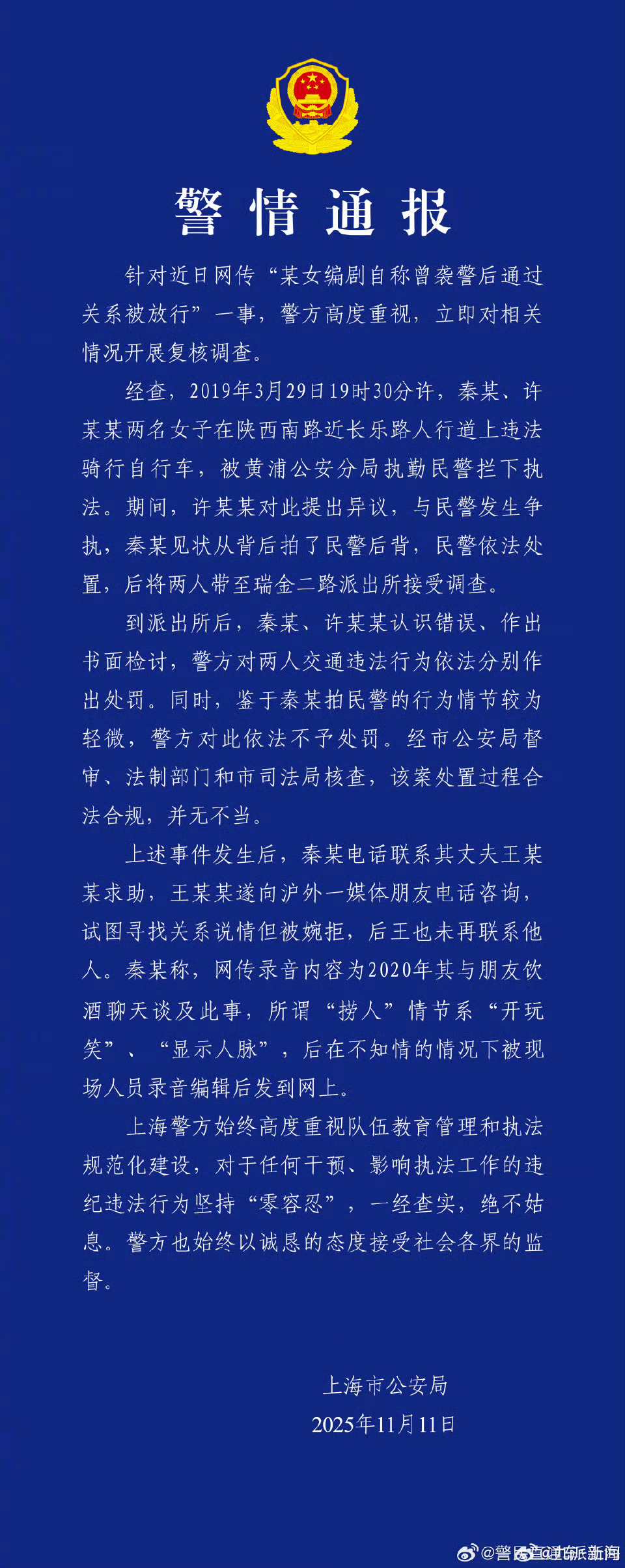 秦雯自称袭警捞人系开玩笑编剧秦雯只是拍打了一下警察后背,然后,编剧秦雯私下和朋友炫耀她袭警,夸大其词本来就是编剧的特长嘛,那句名言怎么说来着,就算她夸大其词,你又损失了什么……警方通报编剧秦雯自称袭警捞人 ​​​