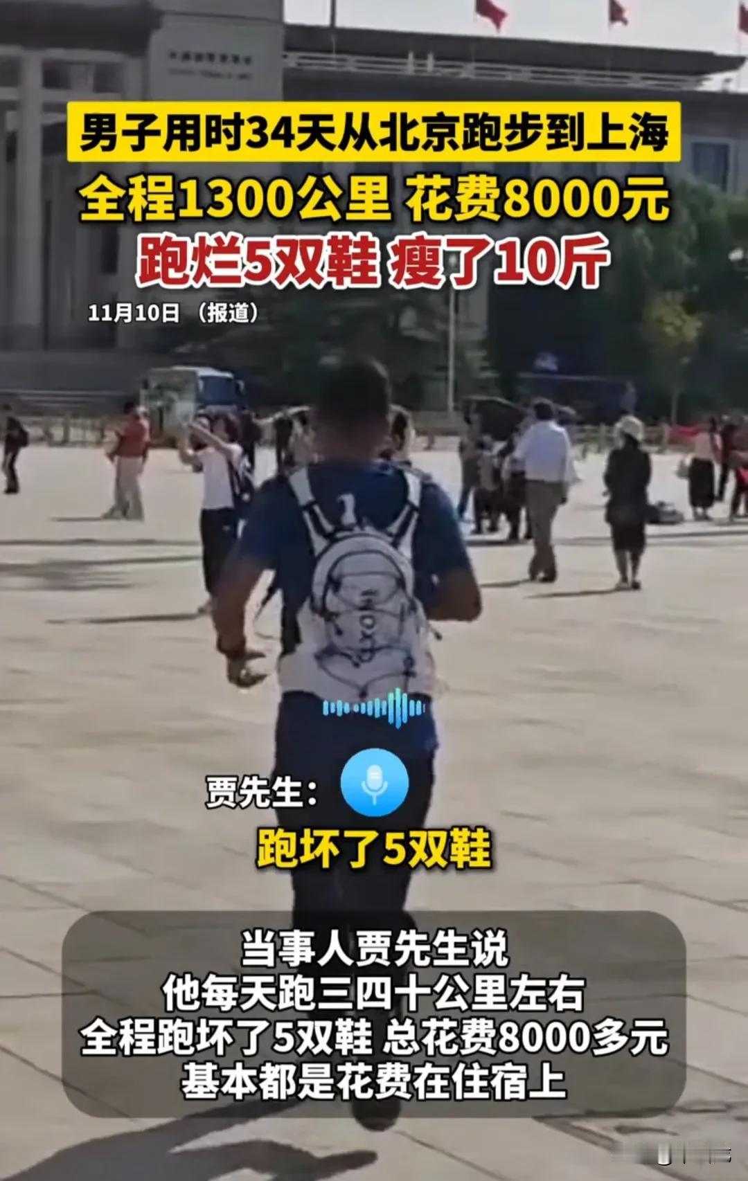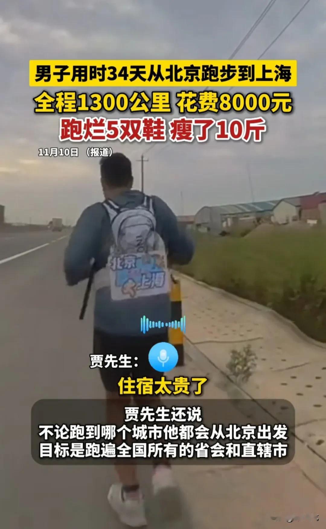 一名长跑爱好者,从北京徒步跑到上海,全程1300公里,用时34天,跑烂5双鞋,花费在8000元左右。 北京到上海坐飞机380,坐高铁五、六百,两个多小时就到了。 长时间在车水马龙的马路上跑步,既存在交通安全隐患,又容易吸入一氧化碳尾气,耳膜还经常受到噪音的污染。 实在不明白,这种跑有什么意义? 只能说有钱人的世界,我们无法想象,人家觉得这是在体验生活,我觉得,这就是典型的没苦硬吃。 跑了一个多月,才瘦了10斤,效果不明显呀。 事实证明,跑步不能减肥。 你应该去报荒野求生,或者晚上不要住酒店,直接露宿公园或桥洞底下,那样才更有意义。 你在跑的过程中,视频是谁给你拍的,难道还有人专门跟着跑吗? (素材来源:藤县融媒)