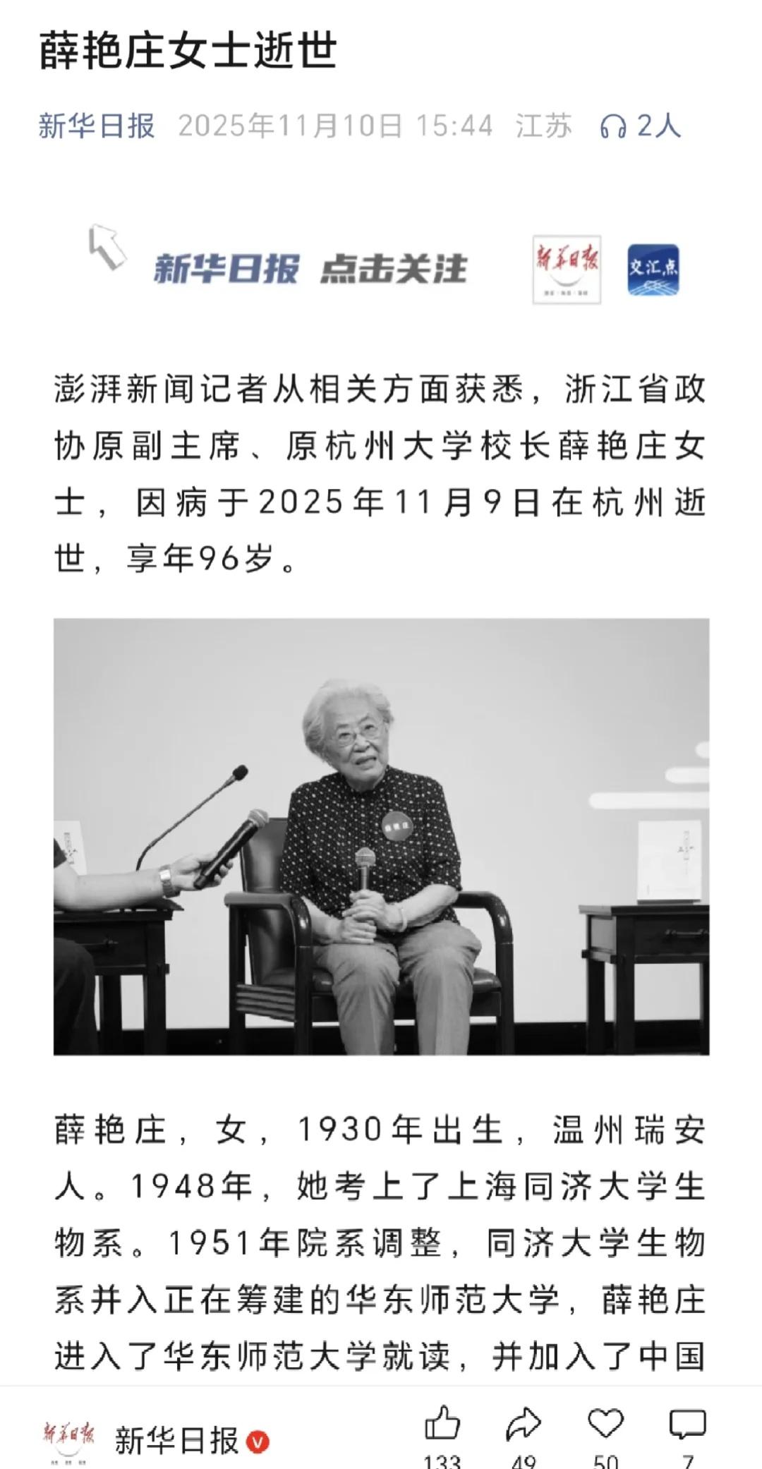 原杭州大学校长薛艳庄女士逝世 浙江省政协原副主席、原杭州大学校长薛艳庄女士,因病