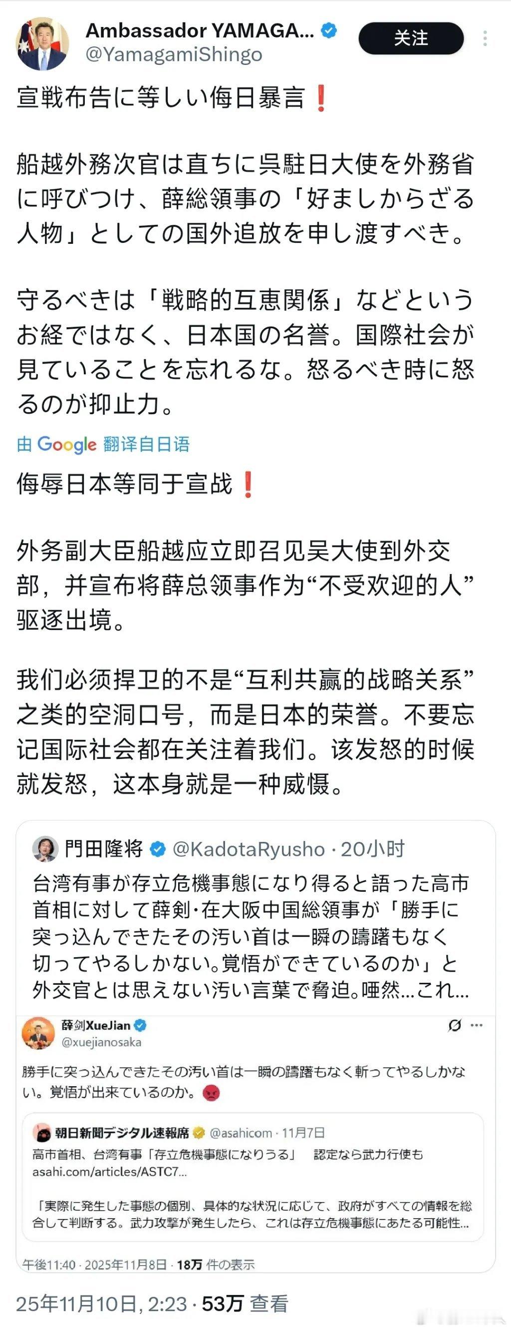 日本人就是不知道自己斤两:日本驻澳大利亚大使山上信吾(Shingo Yamagami)昨天发文写道:“侮辱日本等同于宣战!外务副大臣船越应立即召见吴江浩大使到外务省,并宣布将薛剑总领事作为‘不受欢迎的人’驱逐出境。我们必须捍卫的不是‘互利共赢的战略关系’之类的空洞口号,而是日本的荣誉。不要忘记国际社会都在关注着我们。该发怒的时候就发怒,这本身就是一种威慑。”