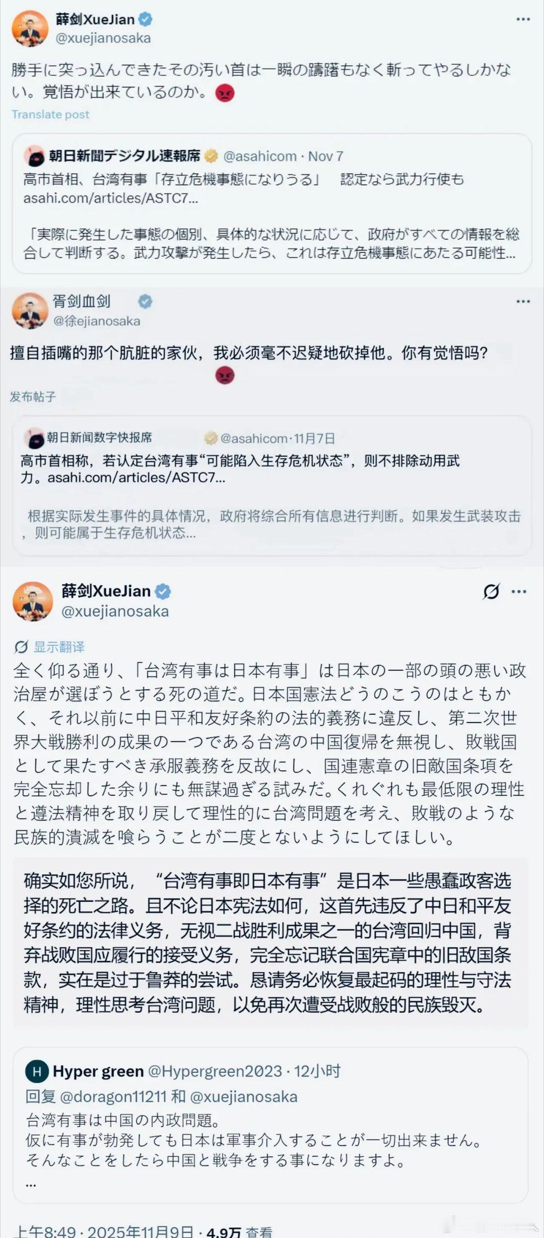 我就认为薛剑总领事发言太好了:"台湾有事即日本有事"是日本一些愚蠢政客选择的死亡之路。“越界就要剁掉狗头”,这不错。