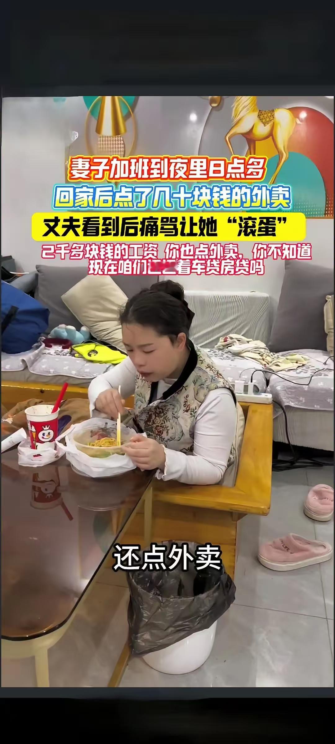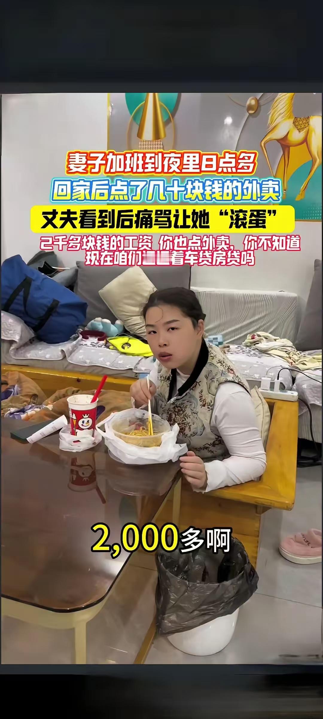妻子加班到晚上8点多,回家后点了几十块钱的外卖。说实话,我很少吃外卖,外卖怎么说呢?贵又不健康,特别是奶茶之类的。 一碗面,一杯饮料,不用几十块钱,平台大把便宜菜饭,十元免送餐费。 点外卖不过份,坐在火桶里吃就过份了啊?更过份的是还不带我吃。 贫贱夫妻百事哀!老婆点餐,有些人会说吃这个不健康我自己煮饭给你吃,我煮饭给你吃不是心疼钱。 每个家庭都有难念的经,不清楚不好评判。如果这个妻子经常性点外卖,那么确实不该;如果偶尔加班累了点一次也无可厚非。 2000多的工资还要加班到8点多,这什么神仙工作啊,赶紧换工作吧。