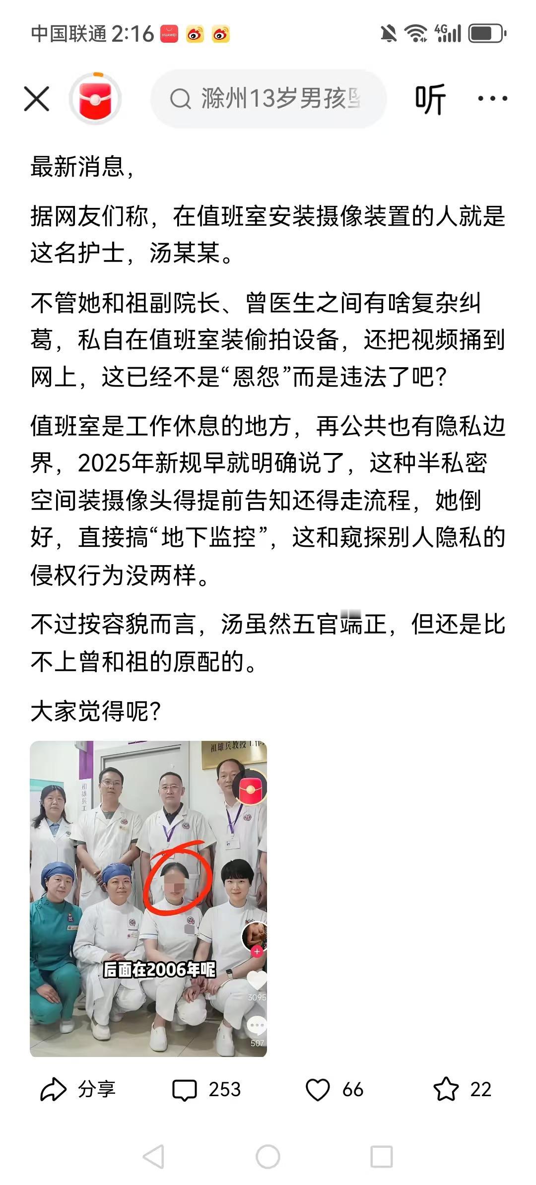 他老婆也是护士,这关系有点什么了,正常情况下,医生与护士的关系,不至于这样被整上网。 值班室是休息的地方,他们为什么可以干私活,汤某某伸张正义打抱不平,不装监控拿不出证据,这样让罪犯没有容身之地,让几个家庭回到原生态,安安稳稳过个好日子。 应该所有少女少妇感谢她,要不然整个医院女性都和他有一腿。 让子弹飞一会吧!相信纪委会进一步调查是否有贪腐行为。 仔细看夫人和这个汤的手挨在一起,像闺蜜。其中就不言而喻了。 偷拍者如被严惩,那以后就可由值班室到抢救室,到病房,到大厅,到任何地方大干特干,反正你不敢偷拍! 汤护士可能是无奈之举,如她直接举报,有人听吗?不会被报复吗? 你不揭发,他不揭发,这个社会让这样的腐败领导带坏了,支持揭发者。 公共场合都应按装摄像头,特别是医生休息区这是重灾区。医院是公共场合吧。这叫破坏公共场合环境,想搞私密的事。就去私密地方啊,不做亏心事,怕什么鬼敲门。 争风吃醋导致安装摄像头,这本身就是违法行为。若要人不知,除非己莫为。