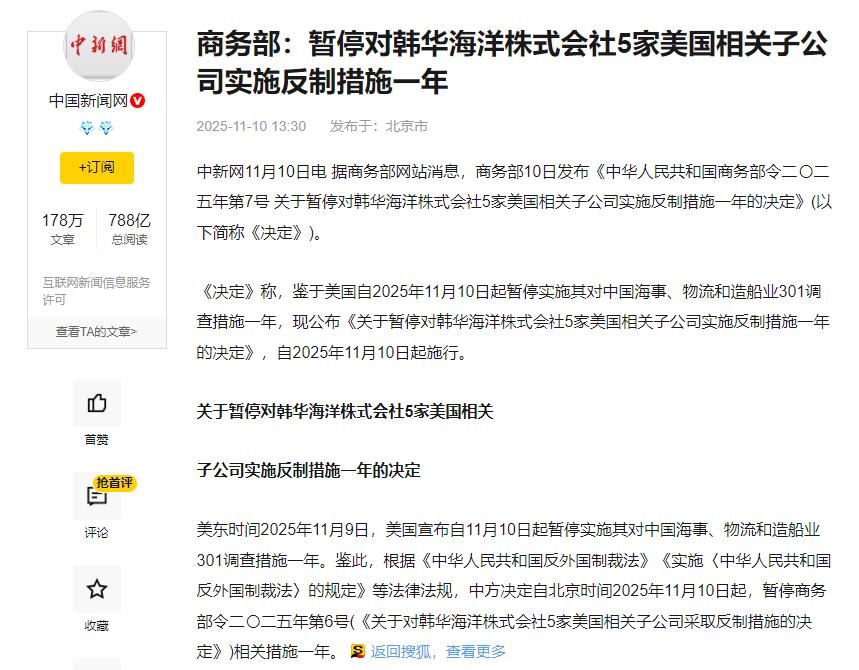 11月10日,美国商务部长卢特尼克发文:“今天,中国宣布暂停对韩华海洋5家美相关