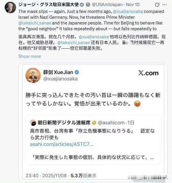 硬气! 火力全开后,看把美国驻日本大使都惹急眼了,要知道咱们驻大阪总领事薛剑可是用事实说话,有理有据!而日本本来就是有错在先,无理站不住脚啊。[碰拳]