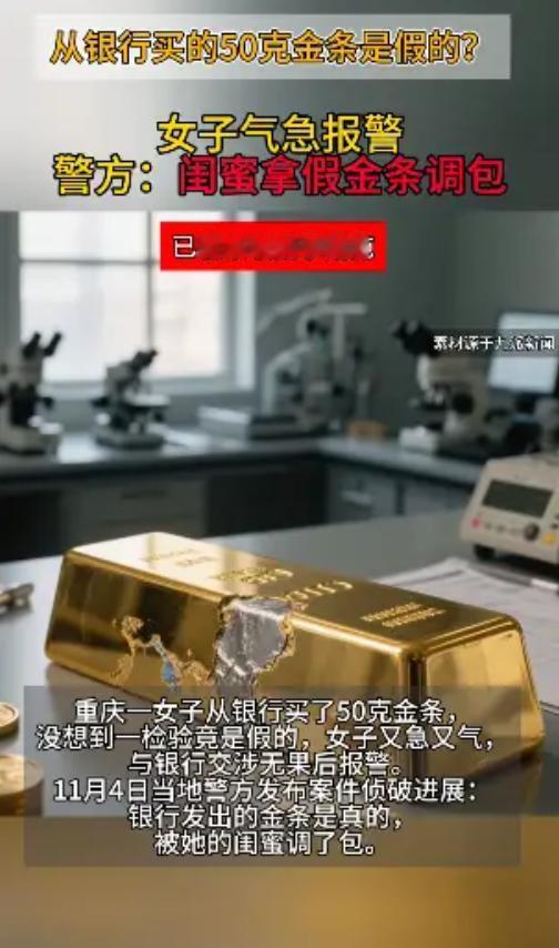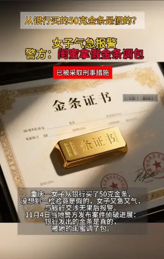重庆,一女子在银行买了几根金条,看金价上涨,就拿了一根去银行兑换,没想到,工作人员查看后却告知这是假的,女子质疑:金条是我在你们银行买的,你现在告诉我是假的?随即选择报警,警方介入后发现银行的金条是真的,问题出在了女子的闺蜜身上,网友:防火防盗防闺蜜!   麻烦看官们右上角点击一下“ 关注”,既方便您进行讨论和分享,又能给您带来不一样的参与感,感谢您的支持!   重庆的覃女士最近经历了一件让她无法接受的事情——她手里明明拿着三年前在银行购买的金条,却被银行告知金条并不是真的。   这根50克的金条,外观上看不出任何问题,但一旦用检测设备扫描,居然被判定为假货。   事情刚开始时,覃女士简直不敢相信自己的耳朵,她出示了购买时的凭证,坚称这金条就是在银行的正规渠道买的,肯定没有问题,于是她带着满腹疑问选择报警处理,案件也很快由警方介入。   警察首先检查了银行的销售流程,调取了当时的交易记录和监控录像,结果显示,覃女士确实在三年前购买了三根50克的金条,且银行的记录与金条编号完全一致,没有任何异常。   根据监控画面,金条出库时的确是正规商品,手续完整,没有任何违规行为,这下,警方排除了银行售假的可能性,问题似乎不出在银行,而是另有隐情。   接下来警方将调查方向转向了覃女士的家庭存放环节,检查发现,覃女士的保险柜外观完好,密码只有她自己知道,没被破坏过。   于是警方询问她是否有任何不寻常的接触,结果她提到了她的闺蜜黄某,黄某曾多次在覃女士家中借住,对保险柜的位置比较熟悉,这一细节瞬间引起了警方的警觉,开始追查黄某的动向。   进一步调查发现,黄某近期曾在一家黄金回收店出售过一根50克的金条和一些黄金首饰,回收店提供的记录显示,这根金条的编号与覃女士的假金条完全一致。   警方还在黄某的网购记录中发现,她曾购买过仿真金条,编号与真金条一模一样,所有线索都指向了黄某,这一切似乎都指向了一个事实,黄某通过某种方式,偷走了覃女士的金条,并用假金条进行了调换。   警方最终找到了真相:黄某在借住期间,发现覃女士的保险柜有时并未上锁,于是她开始从中拿一些首饰出去变卖,看到覃女士没有发现,她的胆子也越来越大,最终决定用一根仿制金条替换掉覃女士的真金条。   黄某甚至通过网络定制了一根与真金条几乎一模一样的赝品,趁着一次正常的拜访,悄无声息地完成了这一交换。   等到警方发现这些线索后,黄某的罪行已经无从抵赖,她承认了自己偷换金条的行为,并且表示那些赃款大部分已经被她用来偿还债务和消费。   最终警方追回了部分赃款,并依法追究了黄某的责任,覃女士的损失也得到了部分补偿,然而对于她来说,损失的不仅仅是金条,还有那段与黄某之间的信任。   这起案件揭示了一个显而易见的道理,熟人作案具有极高的隐蔽性,黄某利用了覃女士对她的完全信任,逐步从首饰小偷到最终大肆盗窃金条,完全没有引起覃女士的怀疑。   也正因为如此,犯案的过程几乎完美地避开了所有可能的检查,虽然保险柜并未被撬开,但信任的破裂和人性中的贪欲却最终让这段友情发生了无法逆转的裂痕。   对此,大家有什么看法呢?