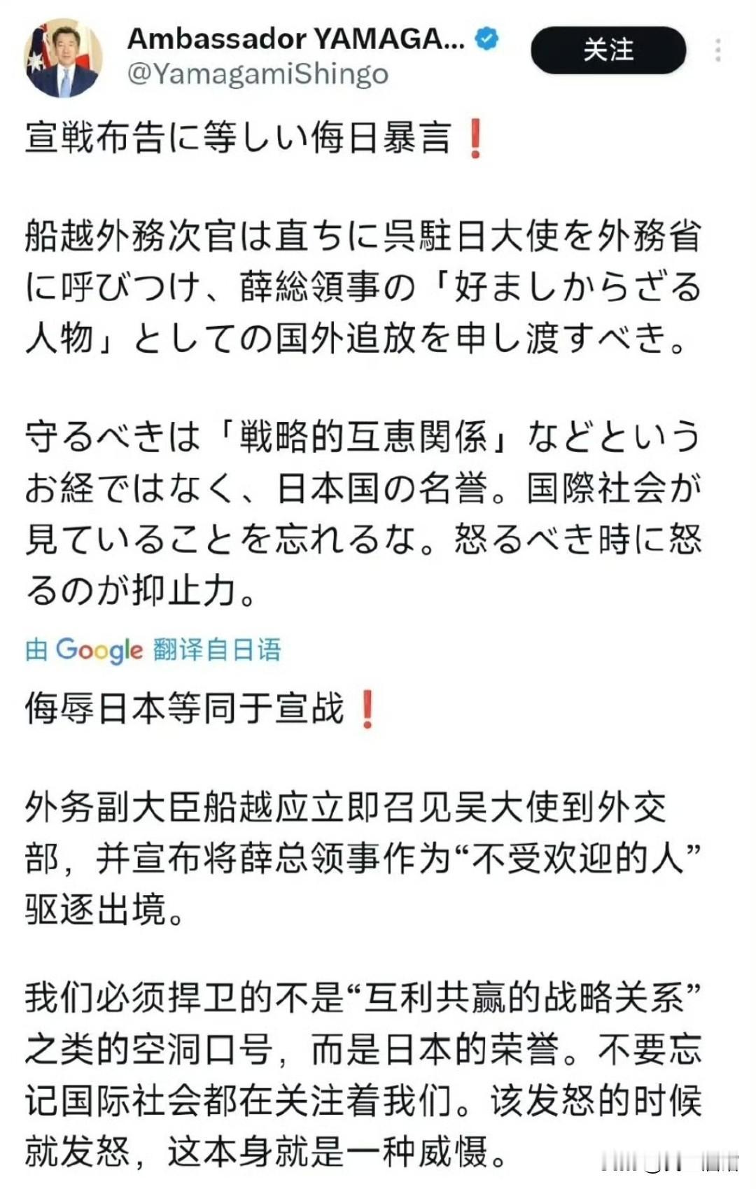 有时候不得不佩服日本人是真敢刚,也真团结啊!日本驻澳大利亚大使山上信吾被薛剑刺激到了,直接说侮辱日本等同于宣战。 我们国内某些说薛剑言论不当的人,那你看看这个山上信吾的言论当不当?如果你说是先有薛剑的话,山上信吾才跳出来讲这种话,那你能否看到是先有高市早苗的话,薛剑才发声的呢? 其实我很想问问这个山上信吾,如果你日本真把荣誉看得这么重,说侮辱日本就等同于宣战的话,那么老美这些年都侮辱你们多少次了,你们怎么不起来跟老美一战呢? 吹牛谁都会吹……关键时刻你得站起来啊。