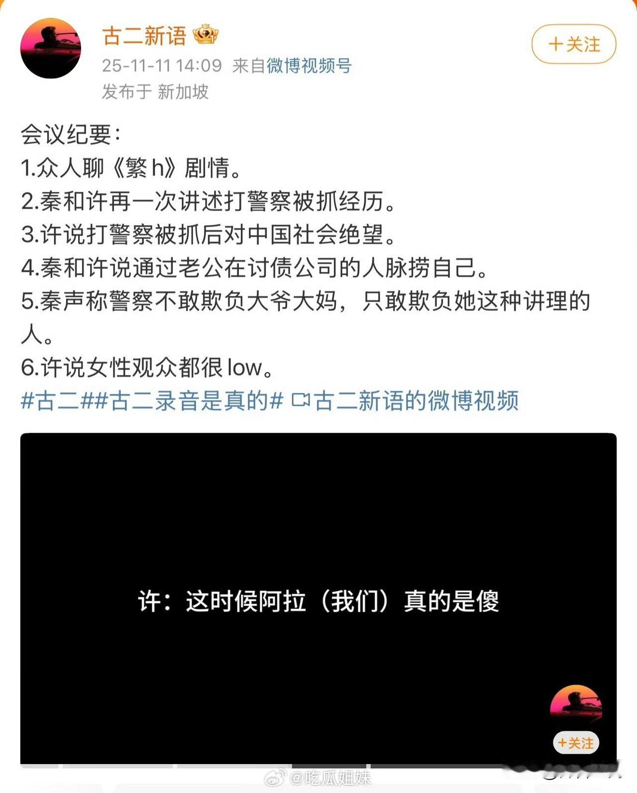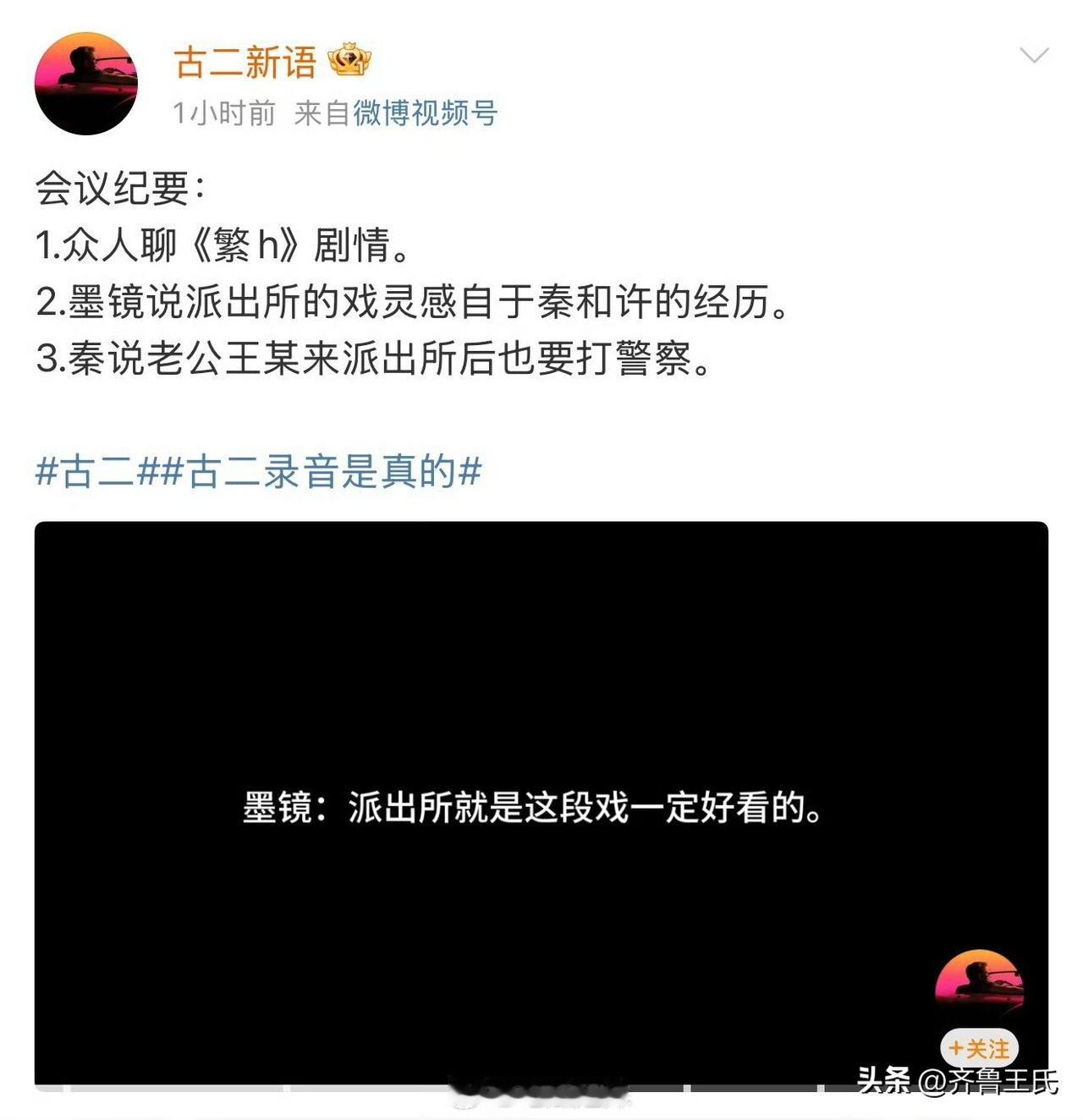古二又发布录音了,立刻打脸了上海警方。 1、录音中,秦雯明确说了她找的人是讨债公司的黑社会,而上海警方却说是沪外的媒体工作者。 2、录音中,秦雯说她老公到了派出所准备打警察,而上海警方的通报完全没有提及此事。 上海警方的通报有一句实话吗? 古二录音