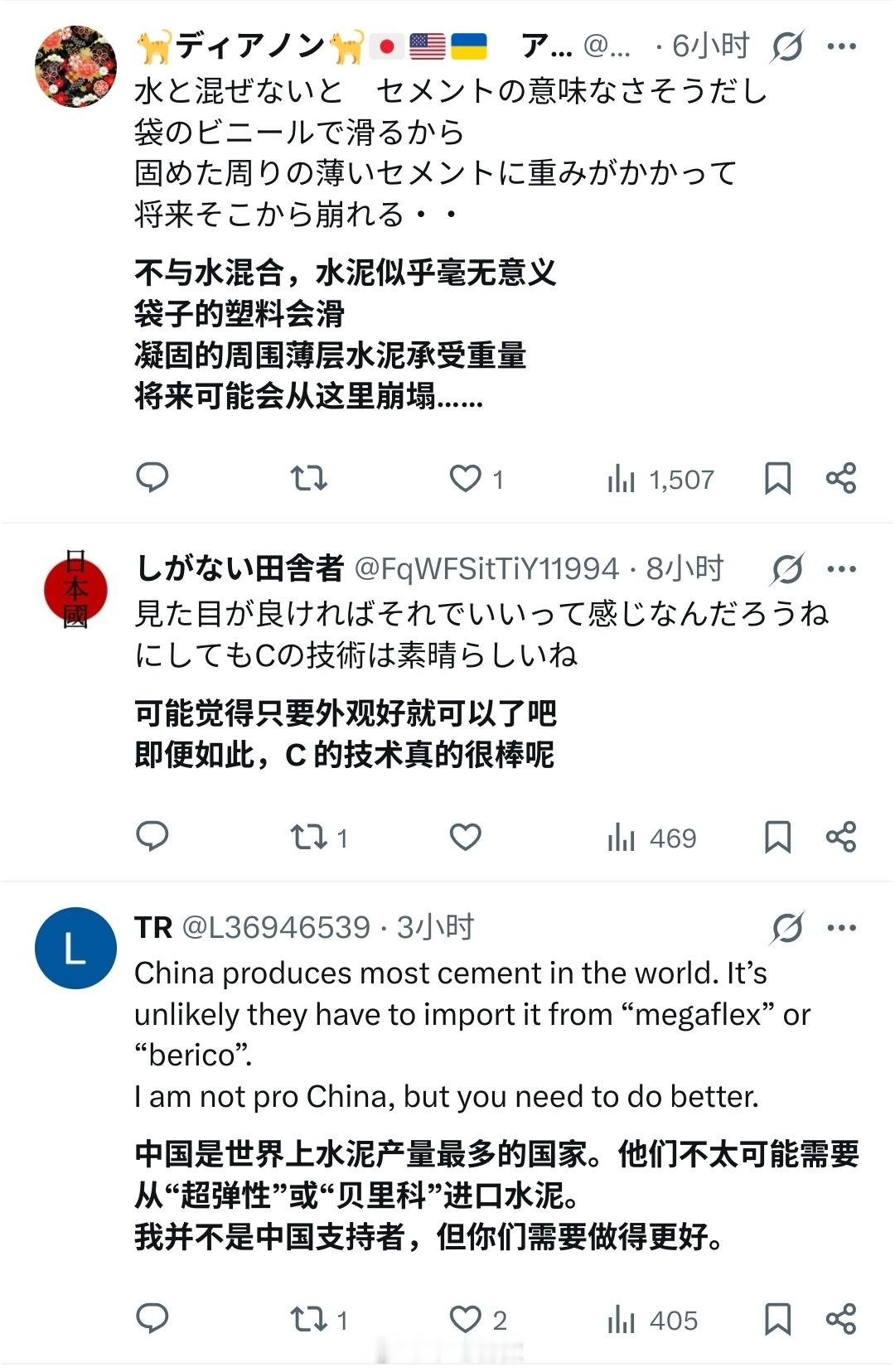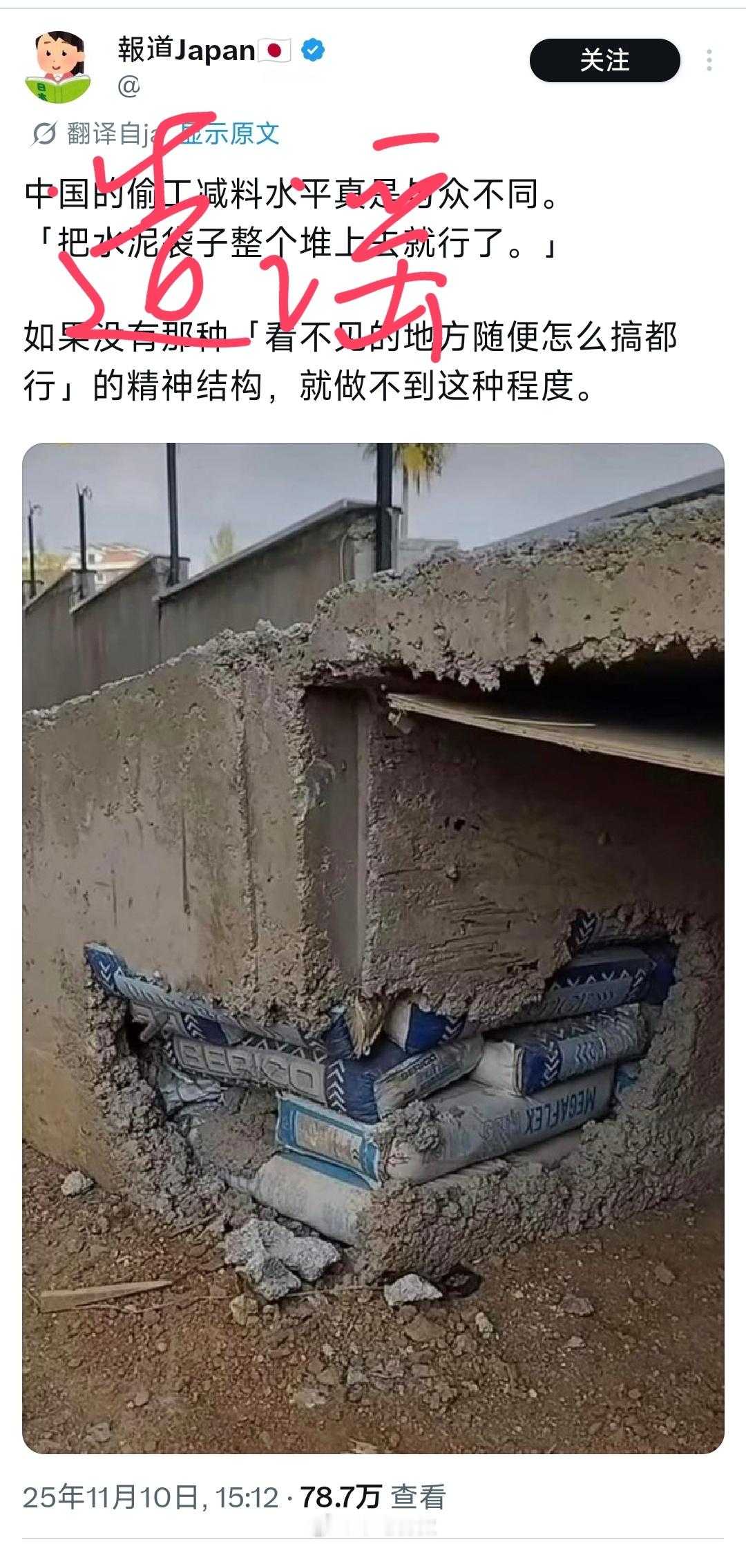 日本人造谣称我国建筑将水泥袋整个砌进墙里,这群人完全是在罔顾事实,现在很多日本人在网上表现的都很极端,充满对我国的戾气,也不知道我们哪里得罪他们了!⭐这张图片里的水泥袋来自两个土耳其企业,我国是水泥等建筑材料的生产大国,不可能进口他国的材料来使用的,所以这张图片明显被张冠李戴了。⭐大部分日本网民看到帖子,不假思索就开始嘲讽起来,那种轻蔑的口吻真是让人厌恶!