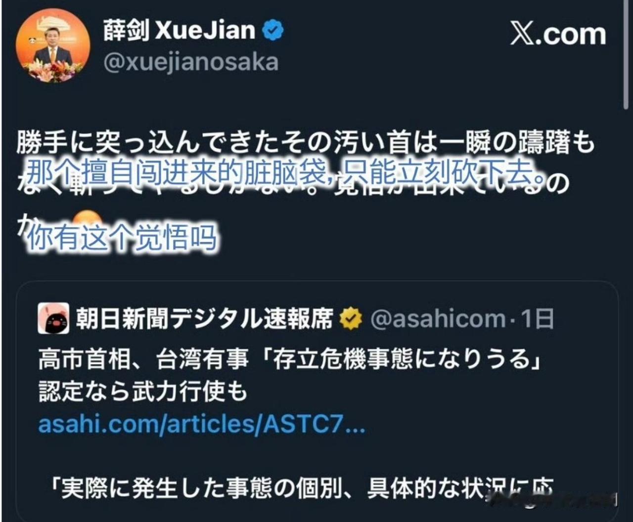 中国驻日本大阪总领事薛剑对高市早苗抛出“斩首说”,在日本舆论哗然。 因为高市早苗涉及对台不当言论,让人非常气愤,所以我们的薛大使才在言语上过激表示日本方面敢在台湾问题上轻举妄动,就要将高市早苗“斩首”! 这一说法也极大的提升了我方的士气,希望薛剑领事说到做到,不要光说不做,不要让当年洛佩西事件重蹈覆辙。