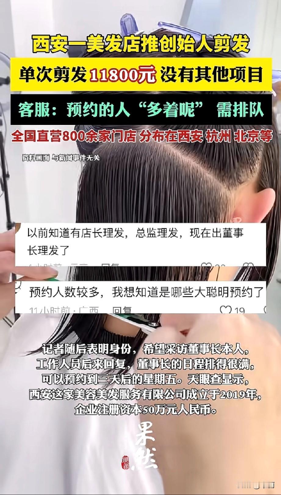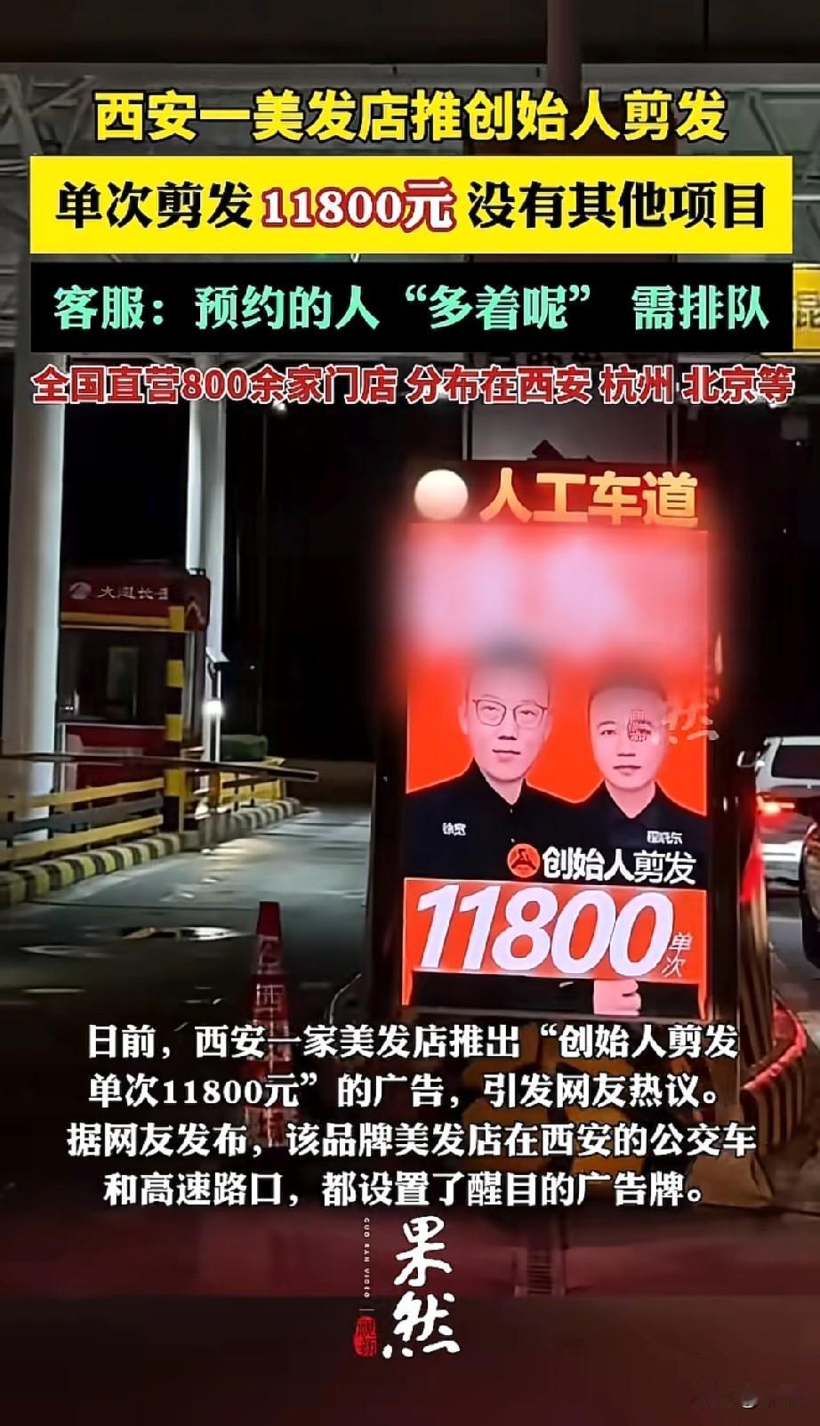 西安徐东美发推出11800元单次的创始人剪发服务,引发热议。这服务就助理洗头加创始人剪发设计,没其他附加项目,门店还有30元、58元起的普通剪发,价格差超大。店家在公交、高速路口打广告,说全国800多家直营店,客服称预约要排队。 查了下,这家公司2019年成立,注册资本才50万,网友吐槽这明显是营销噱头,质疑谁会买单。律师说只要明码标价、消费者知情,交易就合法。其实市场定价自由,但这么高的价格脱离普通消费需求,更像博眼球。不管是真有人买单还是炒作,商家得守住诚信底线,消费者也别被噱头忽悠,理性消费才好。