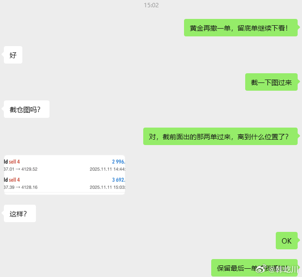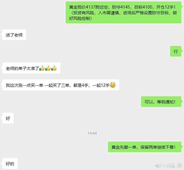 【周二黄金首单三连斩利,本轮收割共计230余点】周二黄金首单现价布局分享给到4137的空,下行止步在4125上方回反,收获呈现120余点给到大家把握!四小时来看,托在短周期均线上方,小时收取底十字反升,目前再次承压在4140下方回撤,4130附近已安排盘中全线撤离,等我下一单分享!盘中位于4137附近分批三单买进,在老韩本人指导下,此前下达4129通知撤出一单,4128再撤一单,留底继续下看,现4131附近全撤,三单共计抓利230余点!!【博文具体布局分享且点击链接查看】 交易,在于果断,而不是一根筋,如发现局势不对,果断收割离场才是最重要的,待机再进才是真理!行情瞬息万变,控制好风险,带好防守操作才是长久之计,投资路上并非坦途,我的文字不算华丽,但是却很真诚,你能看到我写的文章,这是一种缘分,我相信缘分,缘分让我们相遇相知,每一份缘分都应该被珍惜!遇到的人不一样,载体不一样,结果就不一样了!选择远比努力更为重要!