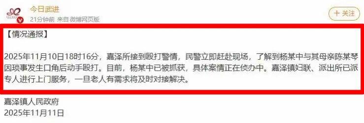 在家暴打93岁的老母亲,这是人干的出来的事吗? 佛教有云:孝养父母是为道之本。 近日,有女子曝光监控下一名男子殴打93岁高龄母亲的画面,让网友们愤怒不已。 从视频中,我们可以清晰看到男子先因为一些琐事,和坐在桌子边的老母亲发生口角。 但不知为何,没说几句,男子就上前开始暴打母亲,多次扇耳光拽头发。 用拳击打母亲的脖子、头部等地方。 老母亲见情况不妙,想立即离开逃离到另一个房间。 可这位男子居然三步并作两步火速追上,再次揪住母亲的头发,把她摔倒地。 并再次对躺在地上的老母亲进行殴打。 发泄完后,男子就像什么事也没发生,继续坐在椅子上喝茶。 相信每一个有良知的人,都不会干出这样的离谱事来。 对陌生人尚且如此,更何况还是把自己一手拉扯到的娘亲! 视频一经发酵,当地部门很快行动,把打人的男子给抓获了,目前案件正在侦办中。 当地妇联、派出所已经派专人进行上门服务。 一旦老人有需求会及时对接解决。 希望这一次,能够给他儿子一个深刻的教训。即便老母亲有些啰嗦,也不该动手打人。