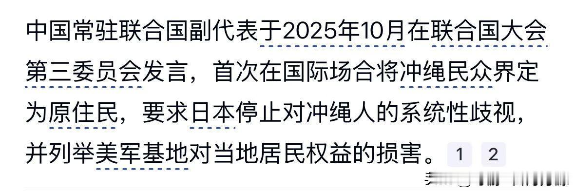 中方在联合国将冲绳民众界定为原住民的发言,是精准的外交发声。 历史上,琉球曾是独立王国,1879年被日本吞并,其原住民身份本是事实,日本长期否认实为掩盖殖民历史。现实中,冲绳承载70%驻日美军基地,民众承受污染、犯罪等代价,却遭系统性歧视,收入仅为日本本土七成。 中方此举既揭露日本对殖民历史的回避、对人权的双标,也为冲绳民众权益发声,以人权话语反制日方借同类议题抹黑中国的行为,让国际社会关注冲绳的被压迫现状,体现了外交策略与正义立场的结合。